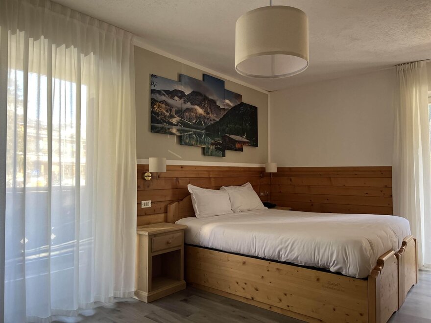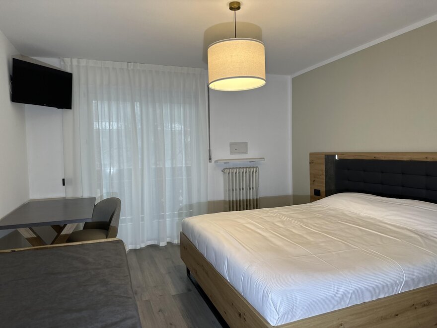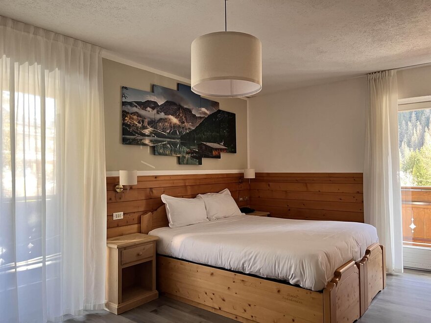 Zimmer mit Doppelbalkon oder Fenster und Balkon, sehr hell, mit Blick auf die Berge, die uns umgeben: Rosengartengruppe, Langkofel, Col Rodella, Pordoi und Sass Becé.Ausstattung Zimmer/Appartement
