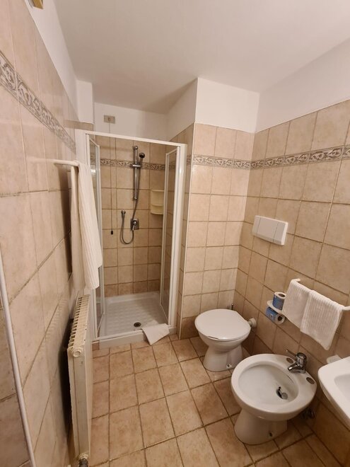 Zimmer mit Balkon und Blick auf die Berge, die uns umgeben: Rosengartengruppe, Langkofel, Col Rodella, Pordoi und Sass Becé.Sanitäre Ausstattung