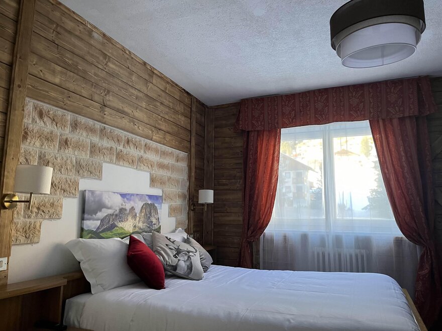 Zimmer mit Fenster und Blick auf die Berge, die uns umgeben: Rosengartengruppe, Langkofel, Col Rodella, Pordoi und Sass Becé.Ausstattung Zimmer/Appartement