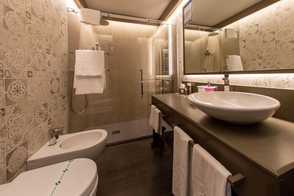 Dreifachzimmer Charme für 3 Personen, geräumig, geschmackvoll eingerichtet und mit privatem Badezimmer aus Marmor mit Badewanne oder Dusche. Jedes Zimmer hat ein kleines Wohnzimmer und Balkon mit Seeblick. Dienste: moderne Dekorationen und Einrichtungsgegenstände aus Holz. Heizung, Schreibtisch, Internetzugang, LCD Fernseher, Telefon, Minibar, Geldschrank, Pantoffeln. Badezimmer mit Bademantel, Haartrockner, Make-up Spiegel, Pflege- und Badeartikeln. Frühstück, Gebühren und MWSt. im Preis inbegriffen.