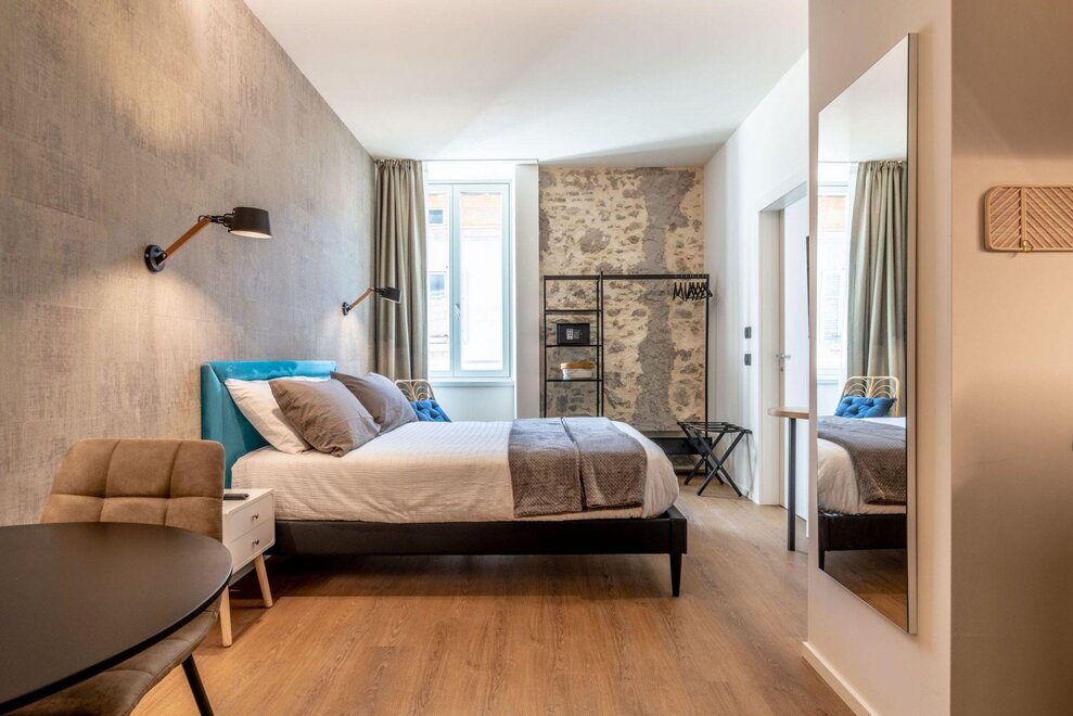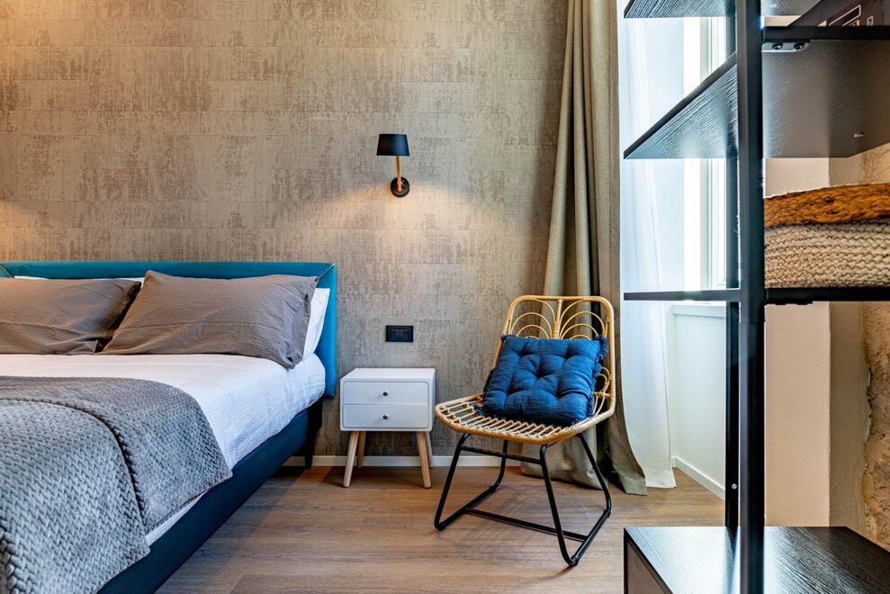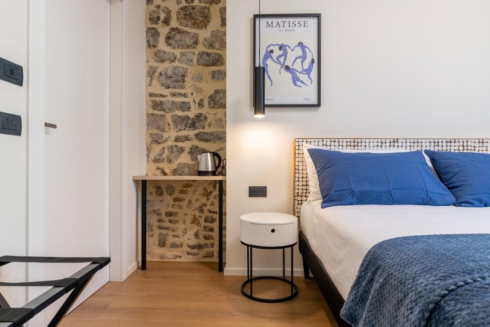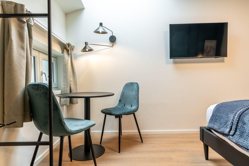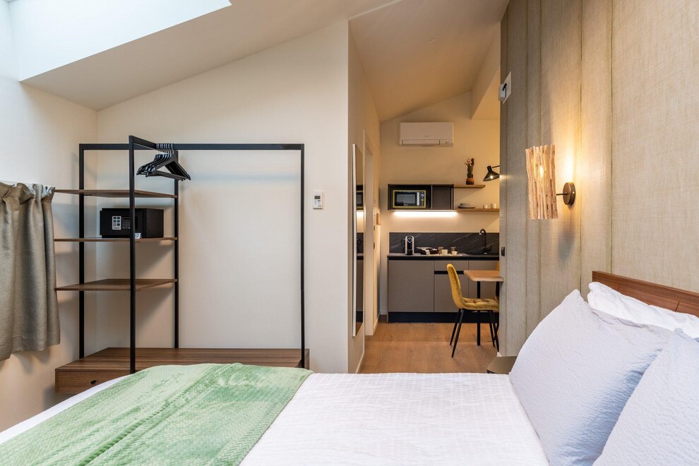 Die Studio Junior Suite verfügt über ein großes, bequemes Doppelbett, ein geräumiges Badezimmer mit XL-Dusche, einen 43-Zoll-Smart-TV und kostenlosen ultraschnellen Internetzugang. Den Gästen werden Handtücher und ein Pflegeset zur Verfügung gestellt.