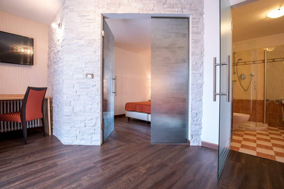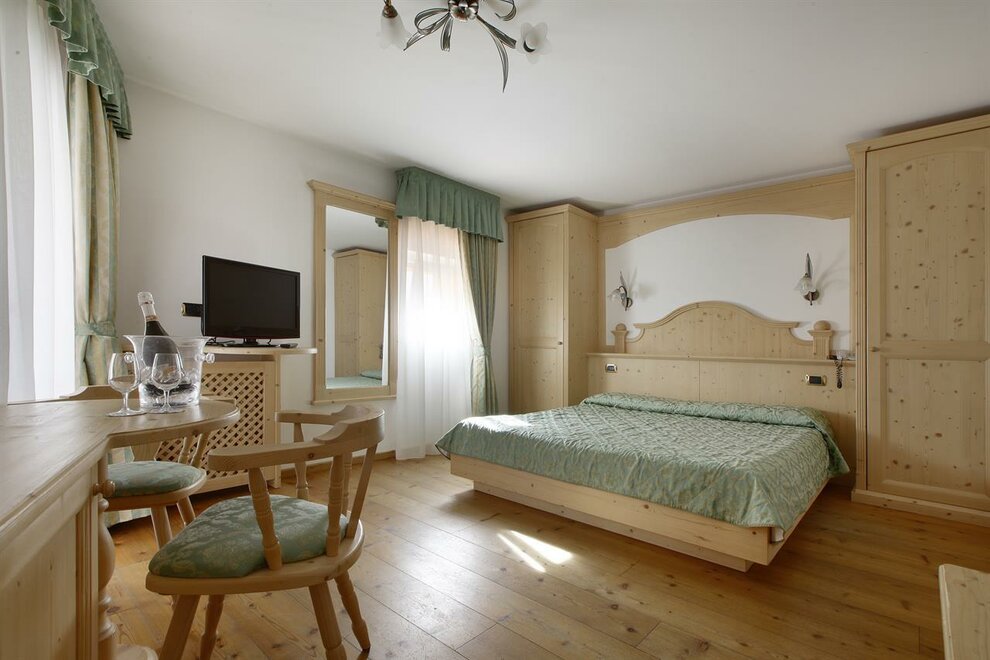 Luxus-Zimmer mit Möbeln aus massiven Tannenholz eingerichtet,Schrankraum,geräumiges Badzimmer mit Jacuzzi Badewanne, TV Color 30‘, Video-Telefon Gerät.