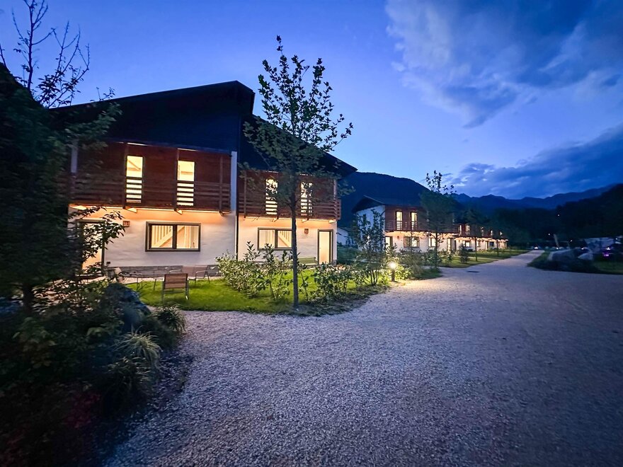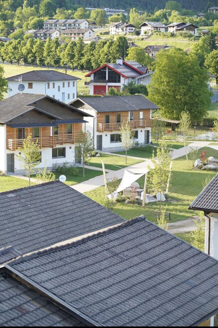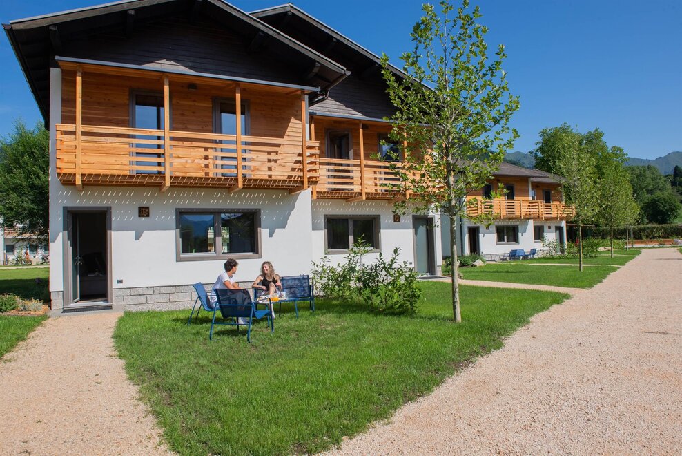 Die Familienferienhäuser bestehen aus 4 Apartments, jeweils zwei im Erdgeschoss und zwei im ersten Stock mit Balkon.