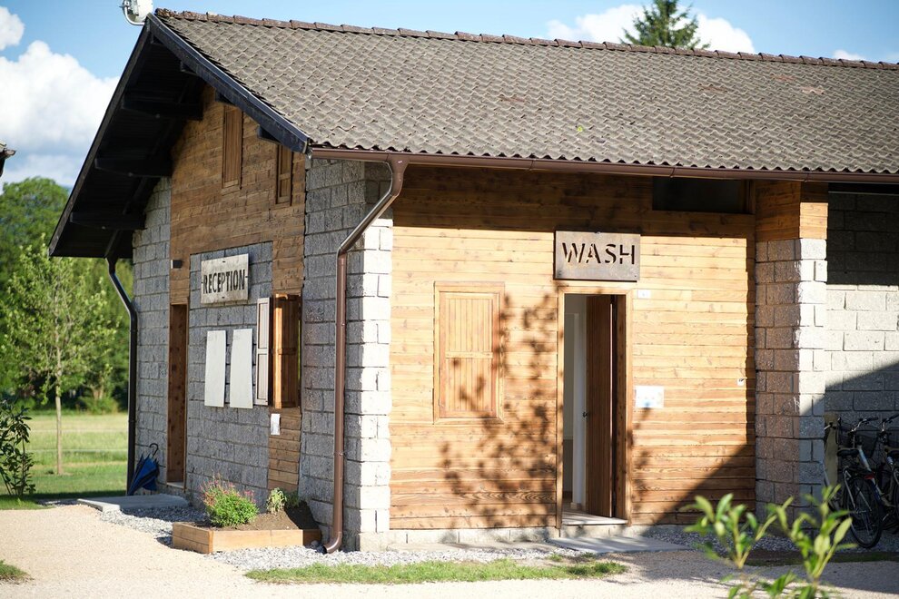 In dem großen gemeinsamen Grünbereich des Dorfs finden Sie den Pool mit Sonnenliegen und Sonnenschirmen, einen Spielplatz für die Kleinen und einen Waschraum.