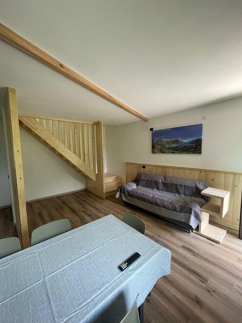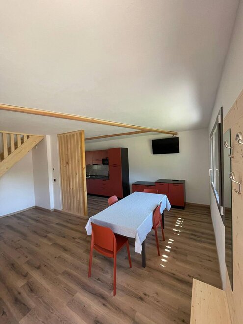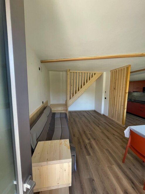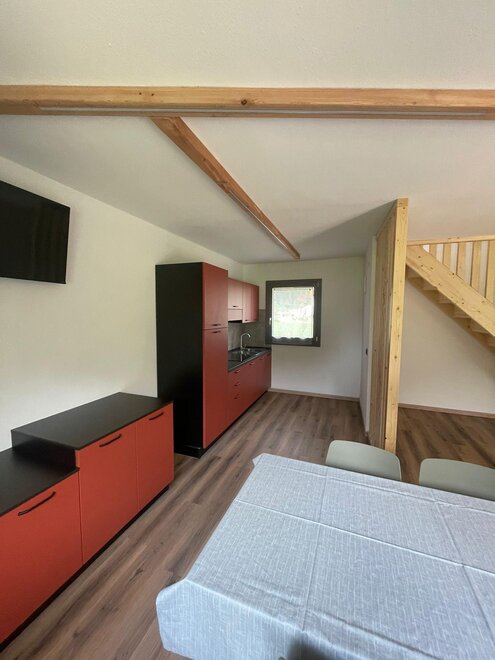 Im Erdgeschoss finden wir ein geräumiges Wohnzimmer mit Küche und SAT-TV.
