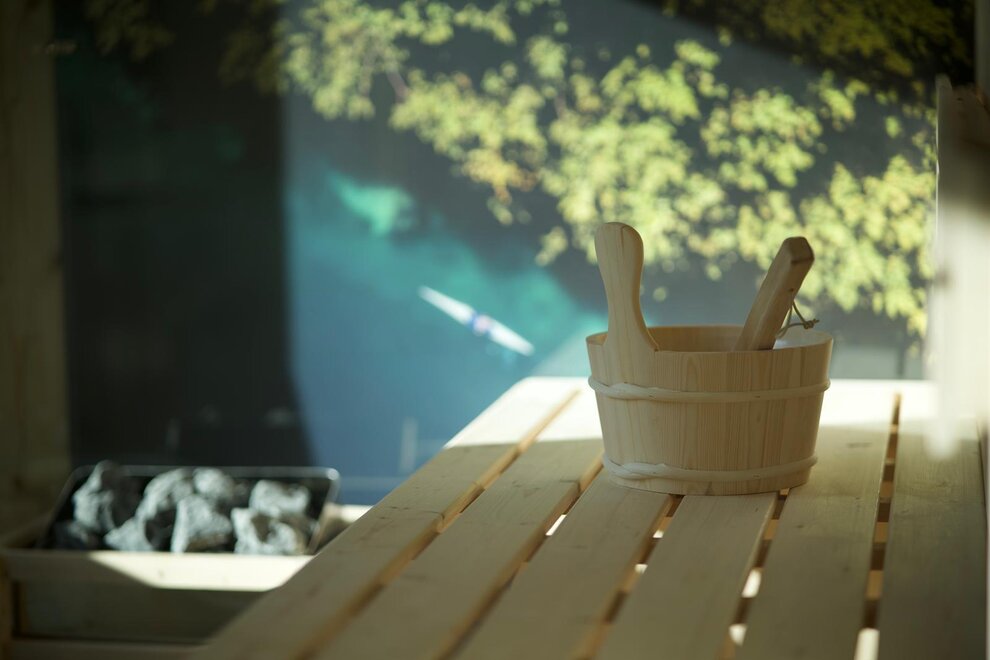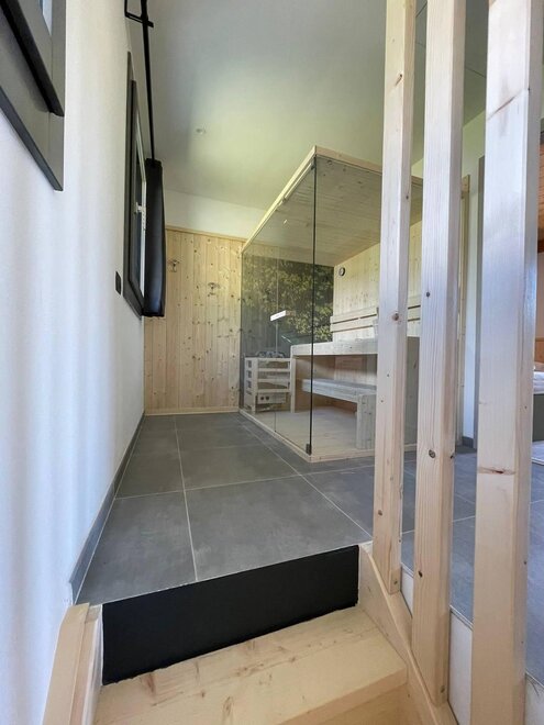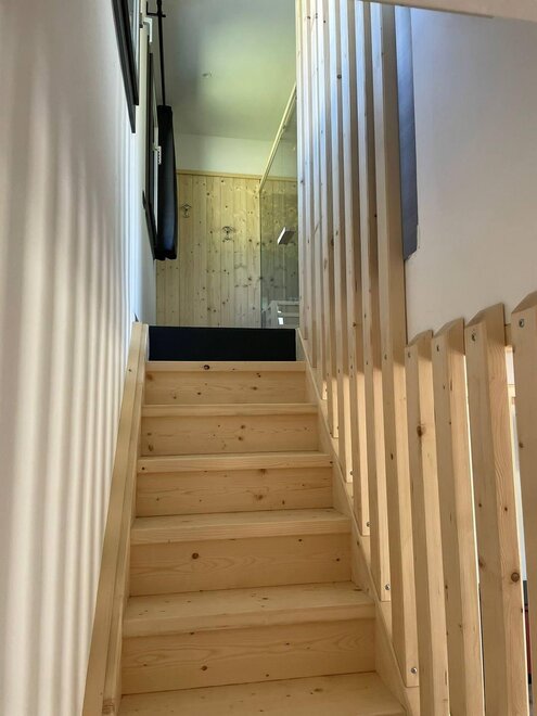 Über eine Holztreppe gelangt man in die erste Etage, wo sich ein Schlafzimmer mit Doppelbett, ein Schlafzimmer mit zwei Einzelbetten, beide mit Balkon, eine private Sauna und das Badezimmer mit Dusche befinden.
