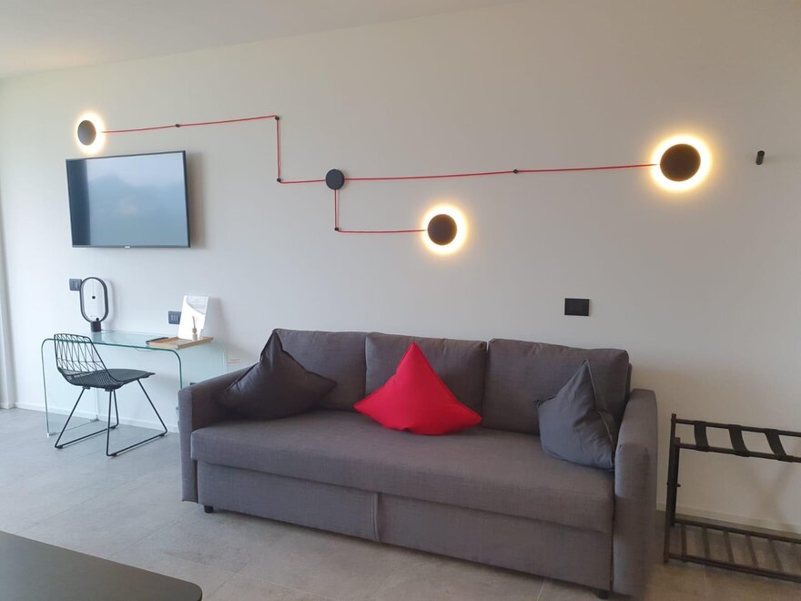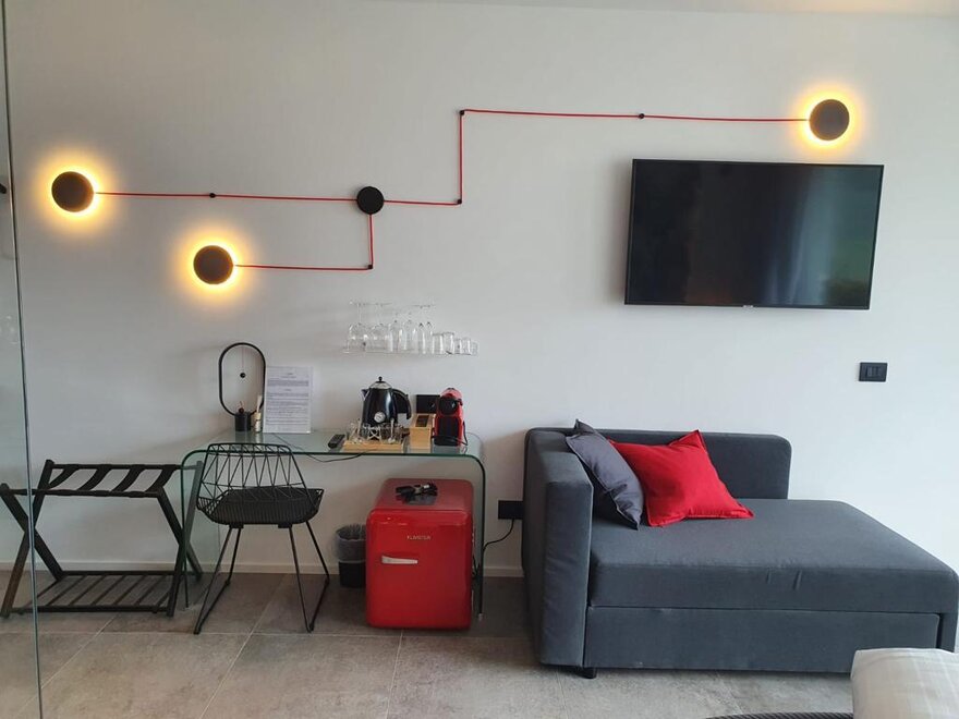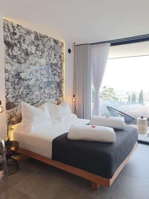 Es besteht aus einem Doppelbett, einer Schlafcouch, einem Schreibtisch, einem offenen Kleiderschrank mit Kleiderbügeln, einem Kofferständer, einer offenen Dusche mit Sichtschutz sowie separaten WC und Bidet. Zudem bietet es eine Terrasse mit zwei Stühlen und einen herrlichen Blick auf den Gardasee und den Monte Baldo.