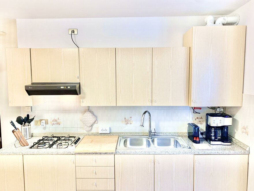 Kitchen with oven, cooker, fridge, coffee machine and kettle