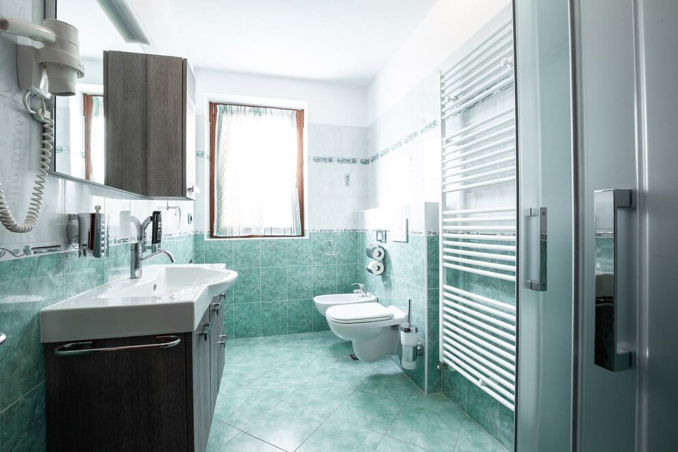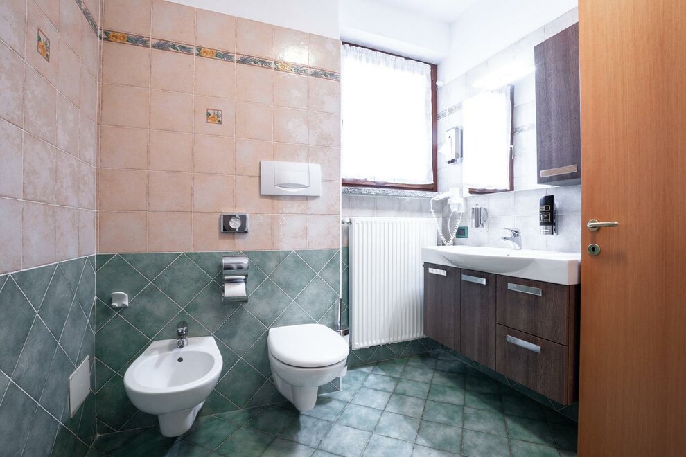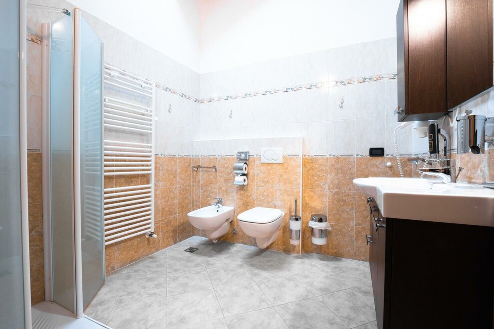 shower, bidet, shower, toilet, running hot/cold water, wash stand, toilet, courtesy toiletries, bath, toilet