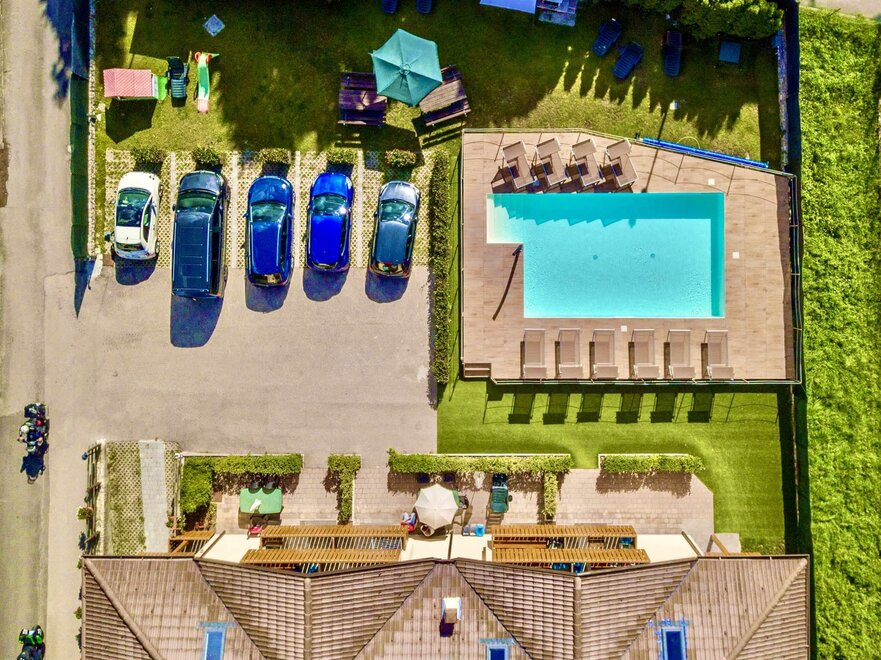 The complex offers a private, completely fenced garden with a parking space, bicycle parking space, play equipment for children, a solarium area, a outdoor dining area with a table, benches and barbecue built of stone. New heated Pool (29°/30°) open from April till October. It is also possible to use a roofed garage.