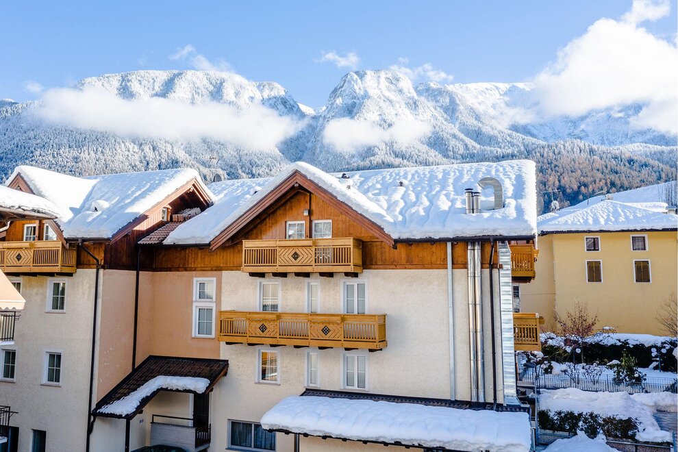 The apartments are located in the depandance/annex building. They’re made up of a double room, bathroom with shower and hair-dryer, living room with sofa bed. Some have pouf bed, kitchenette, balcony. They have Wi-Fi, sat TV in living room, microwave oven, fridge, dishwasher, safety deposit box, phone, locker for skis and boots, parking in the garage, coin-operated laundry at your disposal in the hotel.