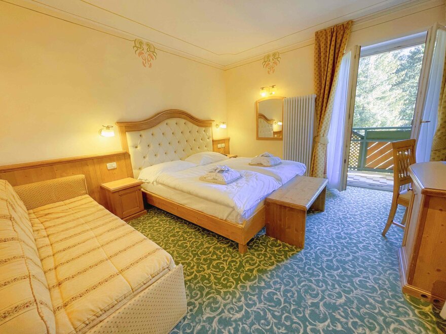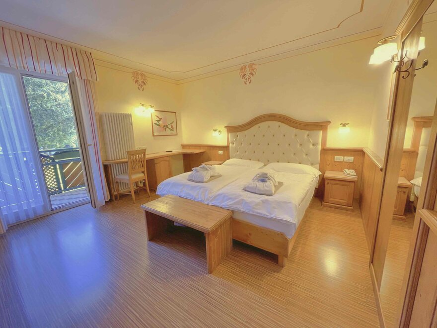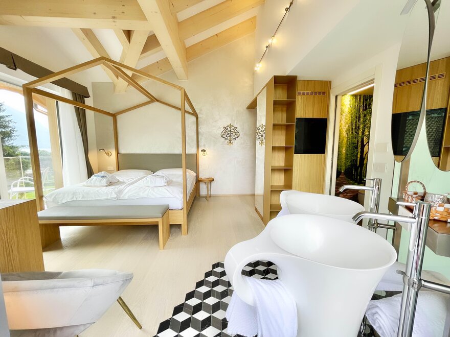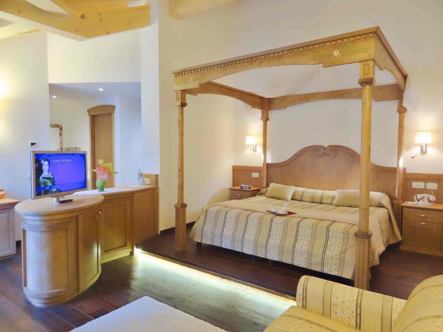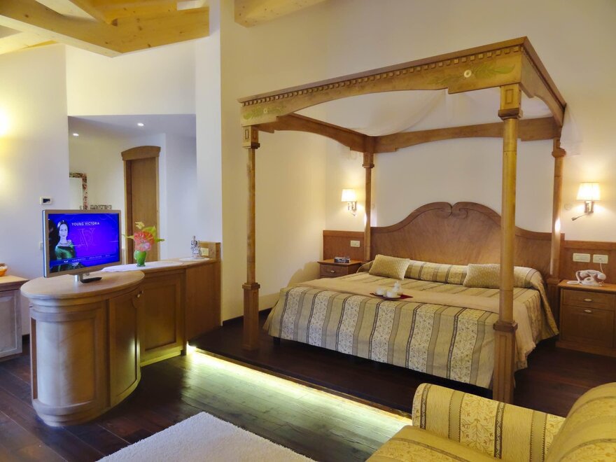 The Royal Suite, furnished in aged larch and fir wood, both natural, has a distinctive large king-size canopy bed, a comfortable sofa, wardrobe, Lavazza coffee capsule machine, bathroom with hydromassage and chromotherapy, and has the balcony with a beautiful view to the Brenta Dolomites.