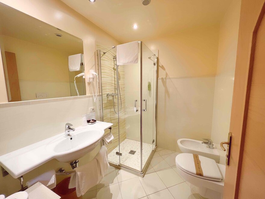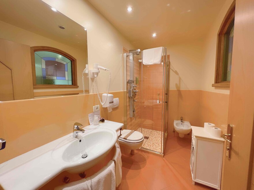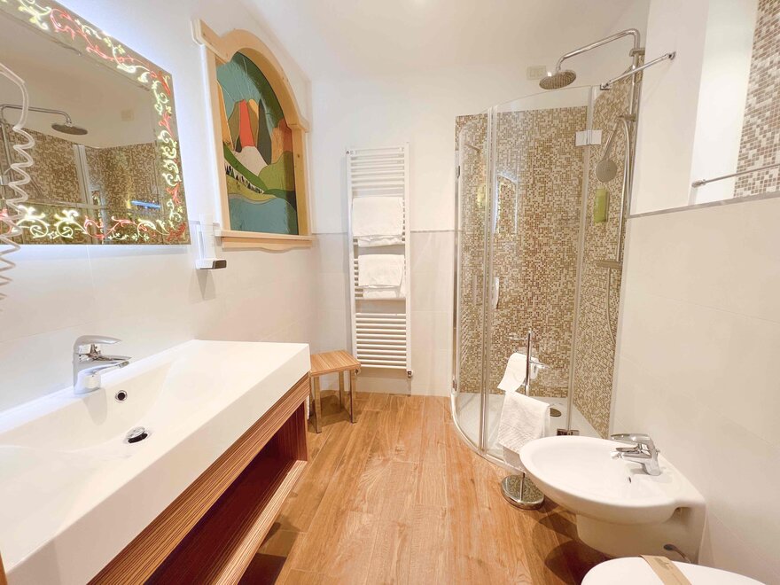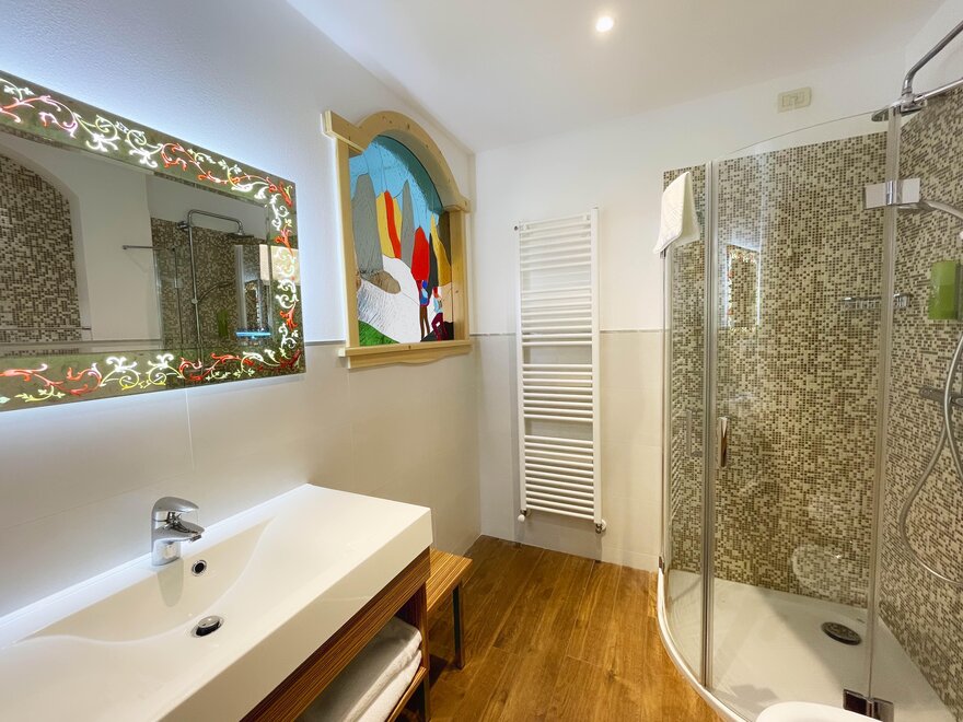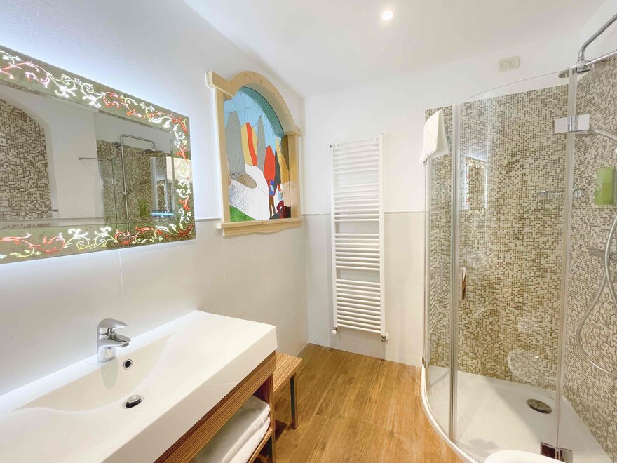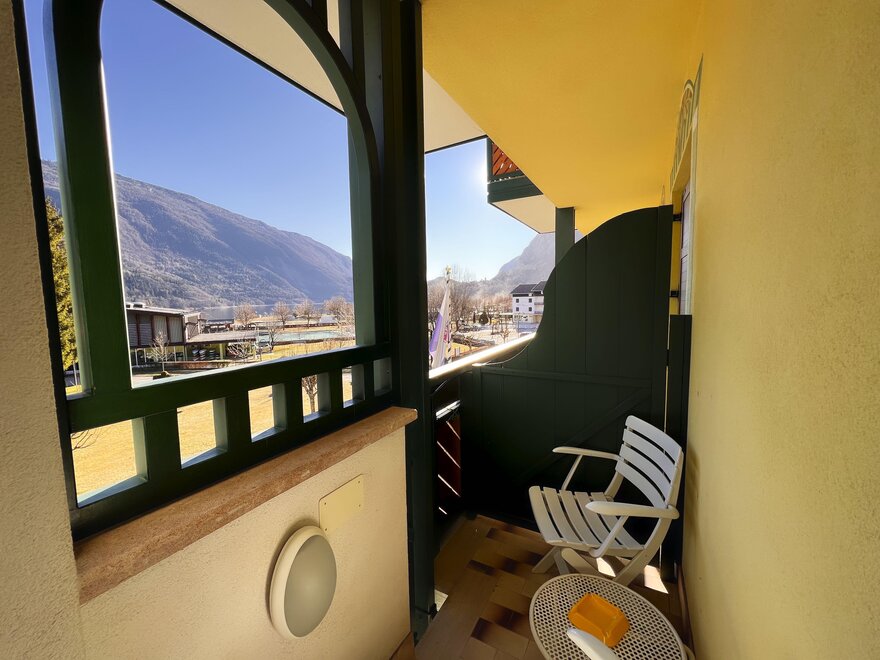 The private balcony, with views of the Dolomites or a partial glimpse of the lake, offers a perfect corner to enjoy the landscape and start the day at a relaxed pace. The bathroom with shower is practical and comfortable, designed for refreshing oneself after a day outdoors.