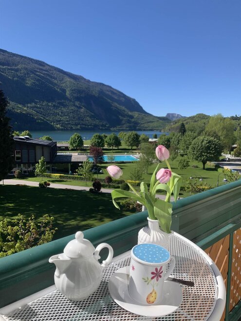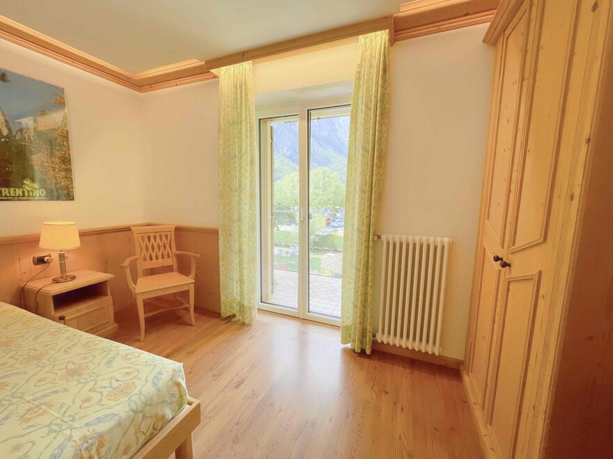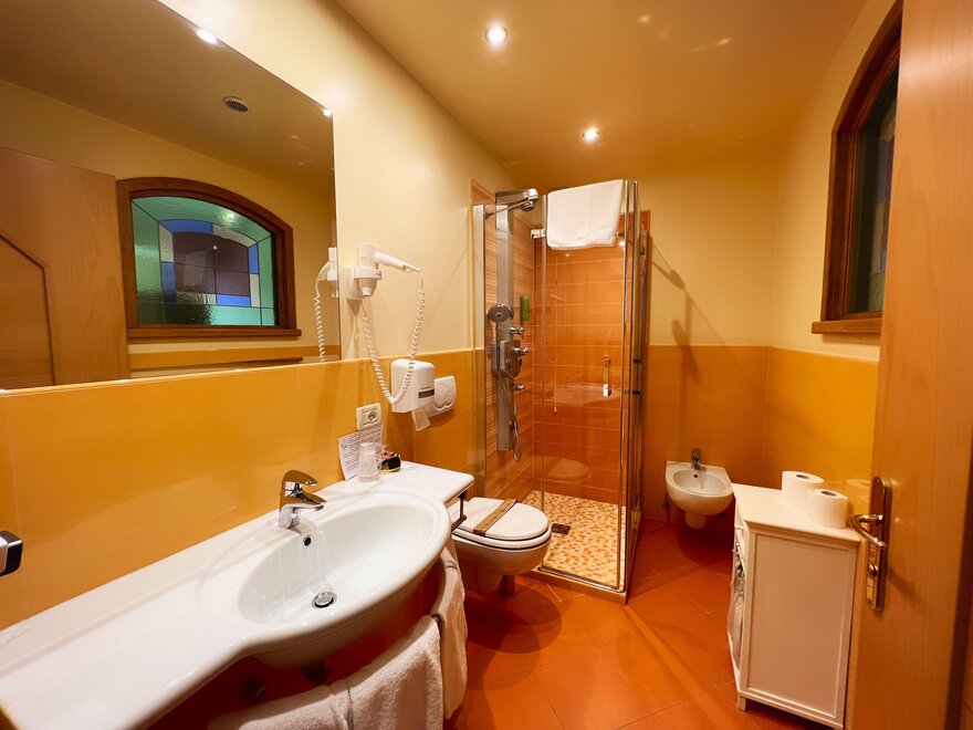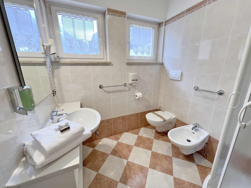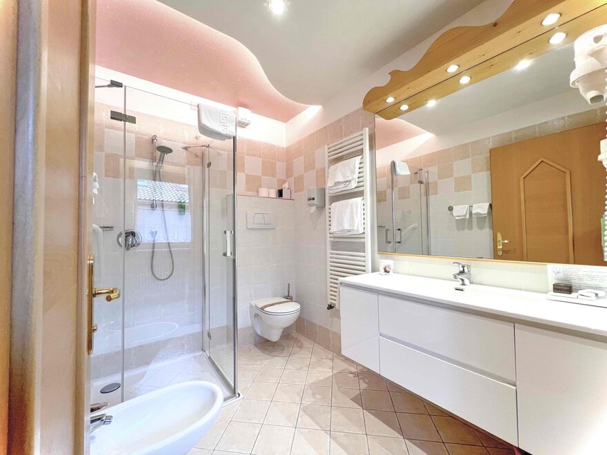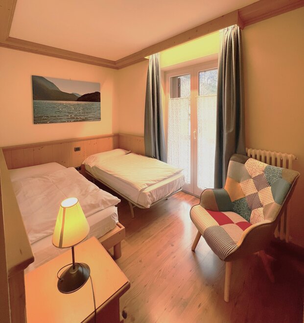 The private balcony, with views of the Dolomites or a partial glimpse of the lake, offers a perfect corner to enjoy the landscape and start the day at a relaxed pace. The bathroom with shower is practical and comfortable, designed for refreshing oneself after a day outdoors.
