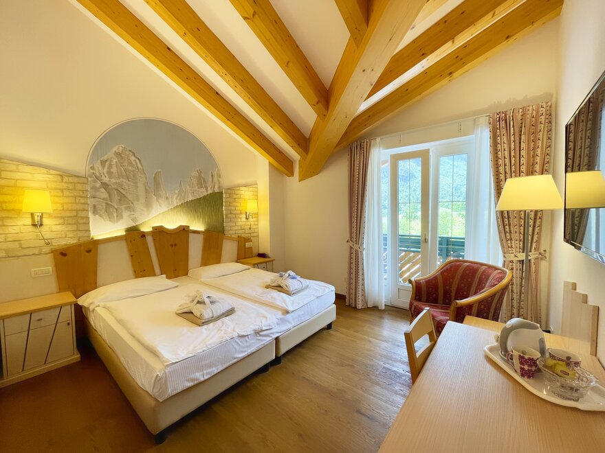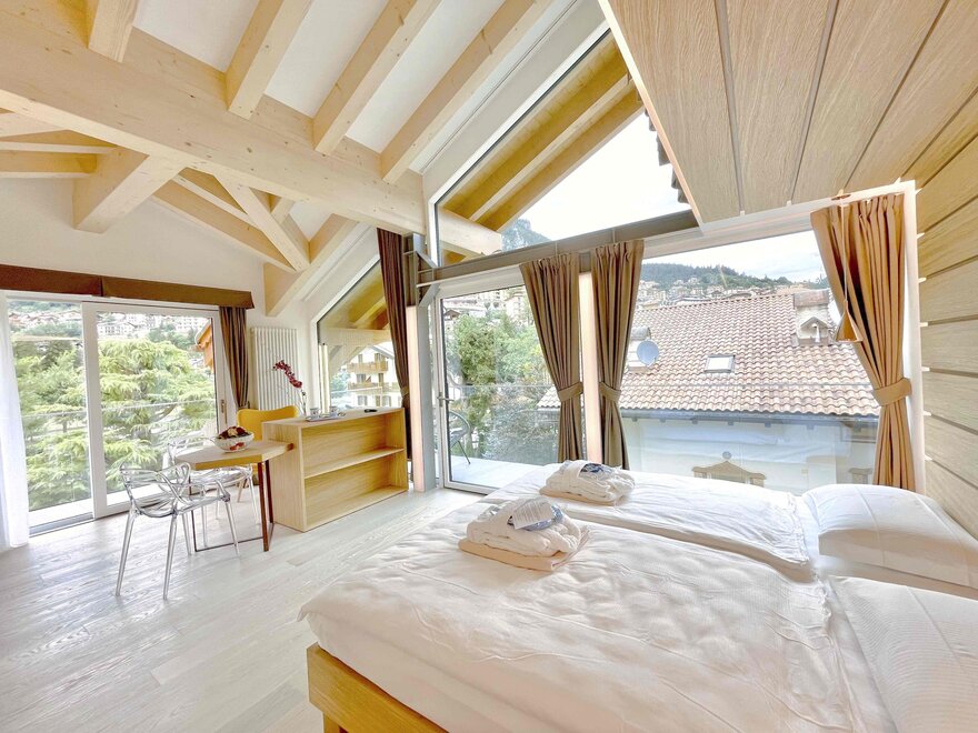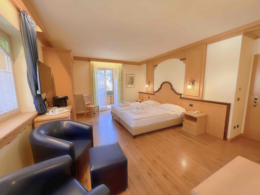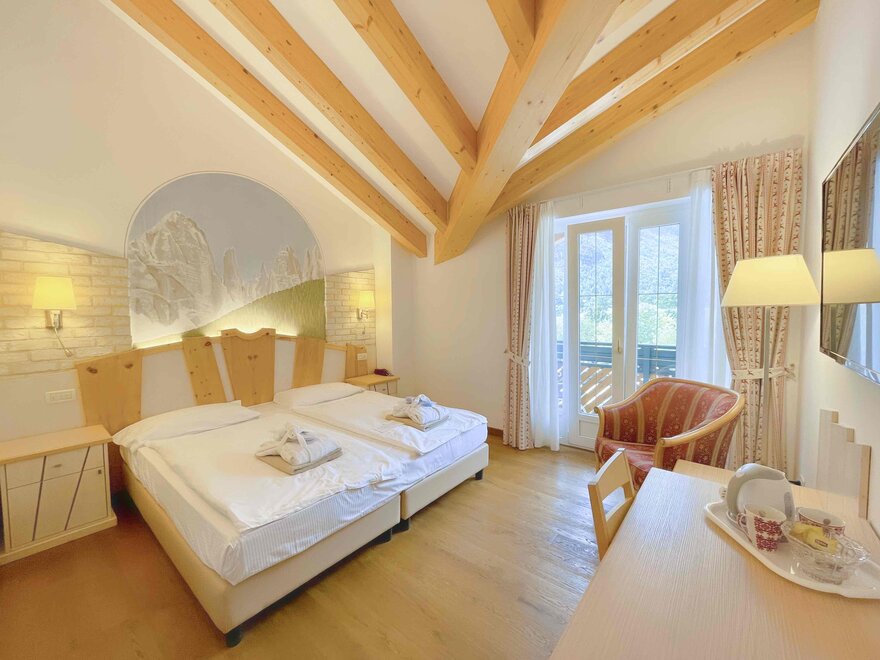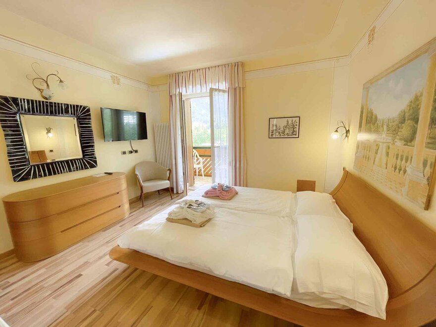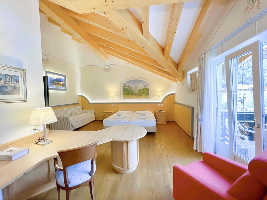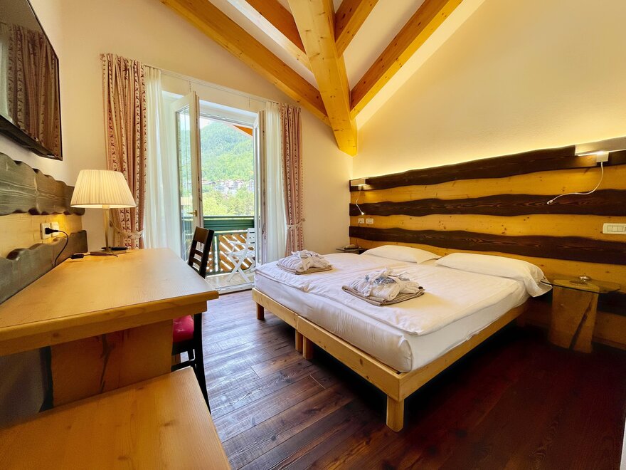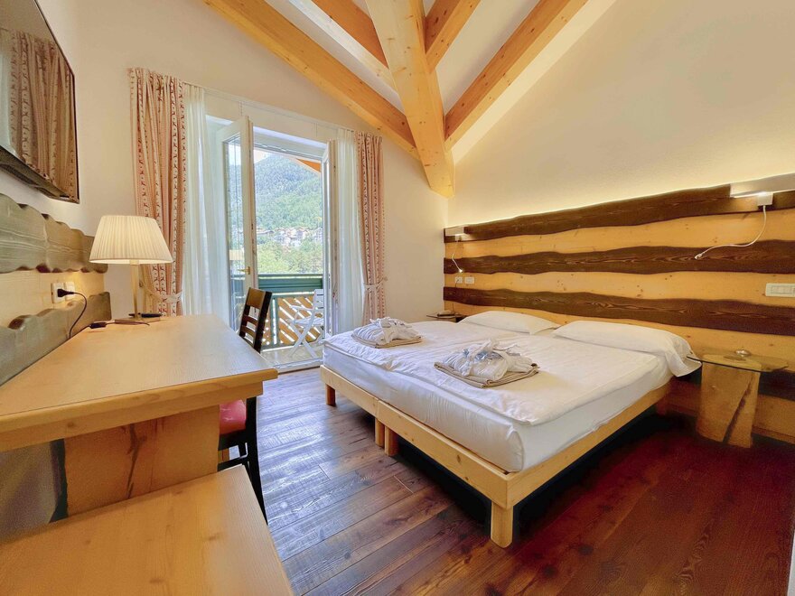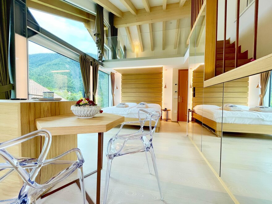 Brand new Junior Suite with two balconies with panoramic views of the Brenta Dolomites, bathroom with shower, 42-inch TV, mini bar, mezzanine lounge.