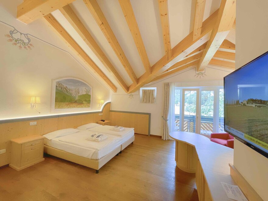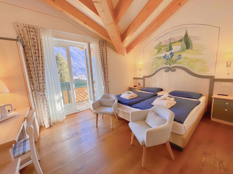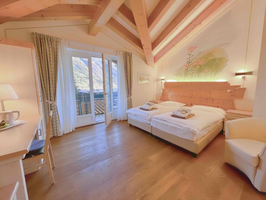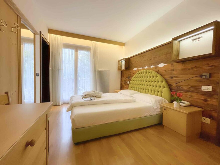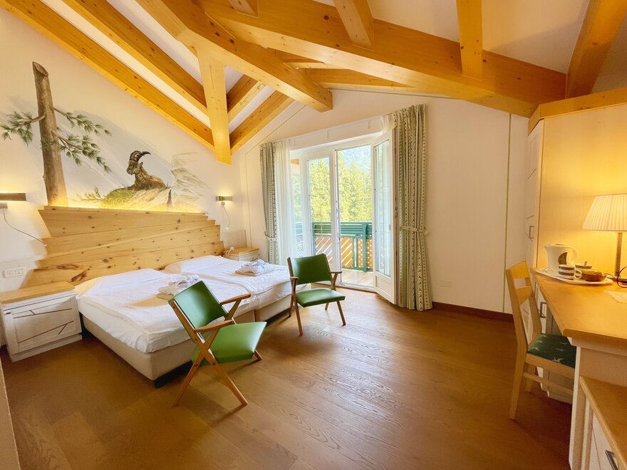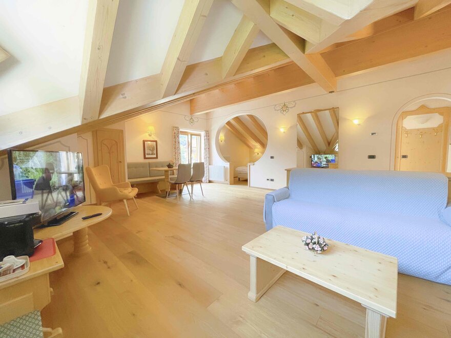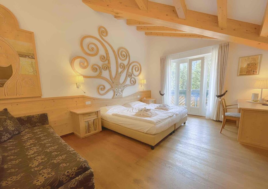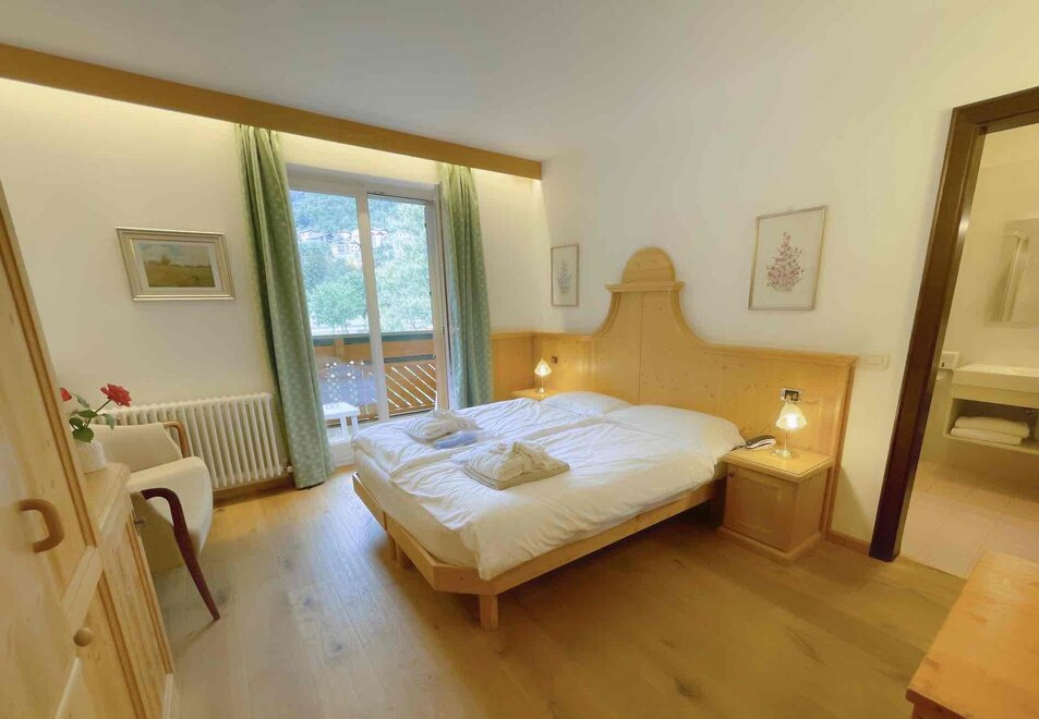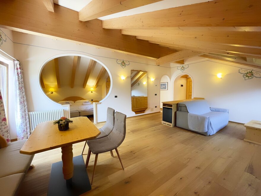 Brand new Junior Suite with two balconies with panoramic views of the Brenta Dolomites, bathroom with shower, 42-inch TV, mini bar, mezzanine lounge.
