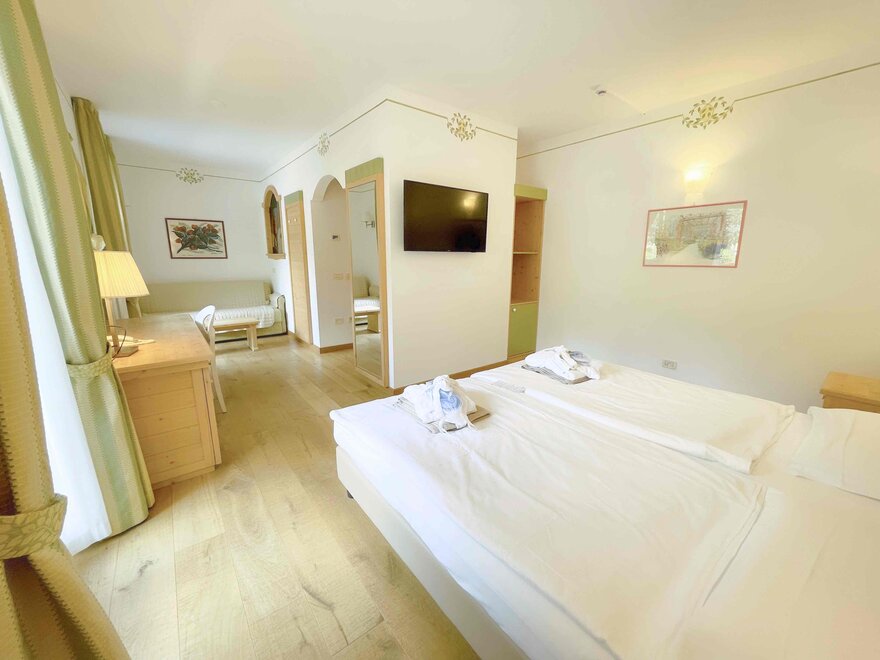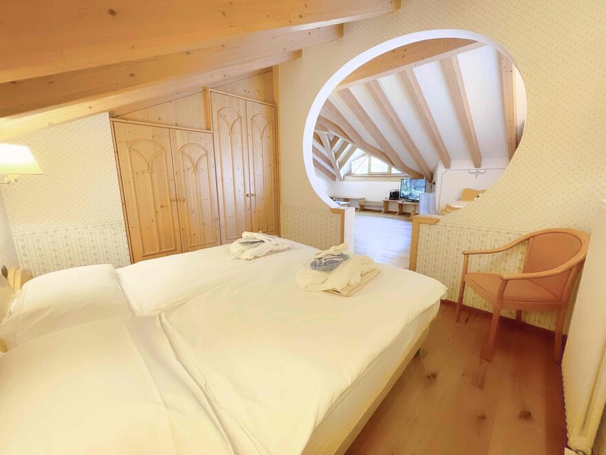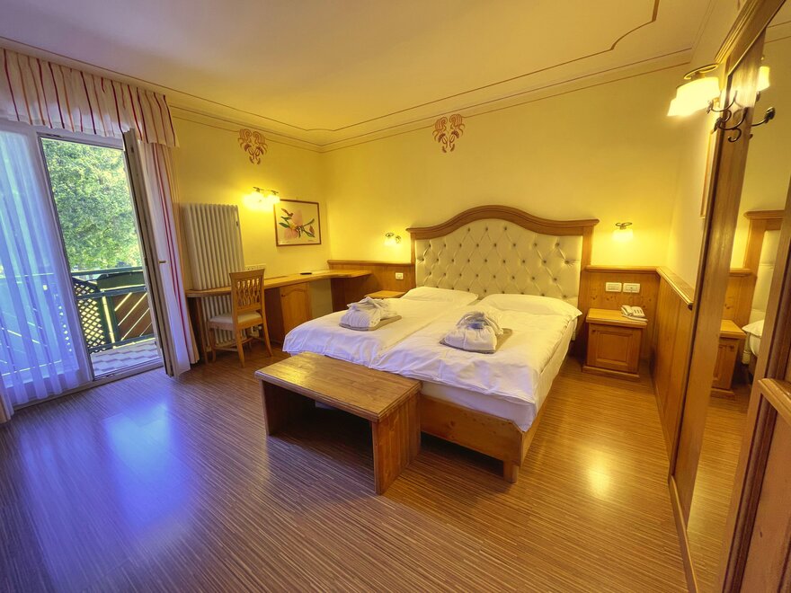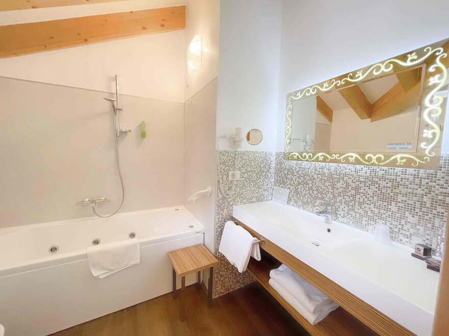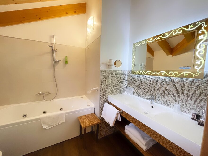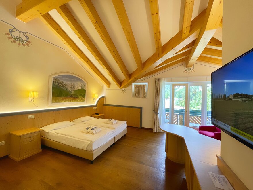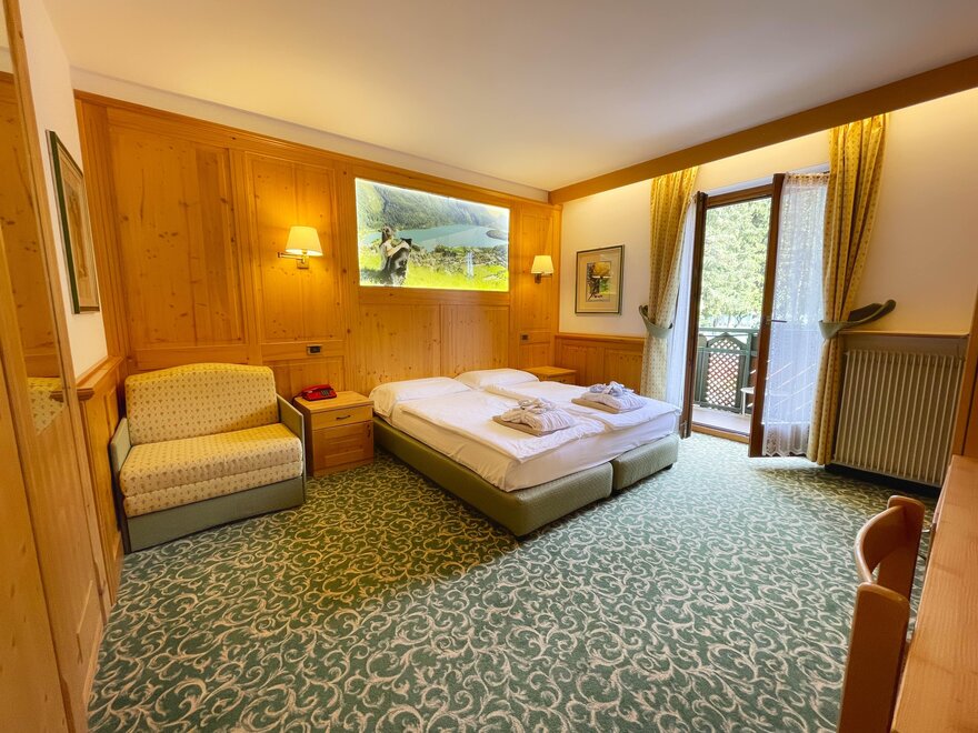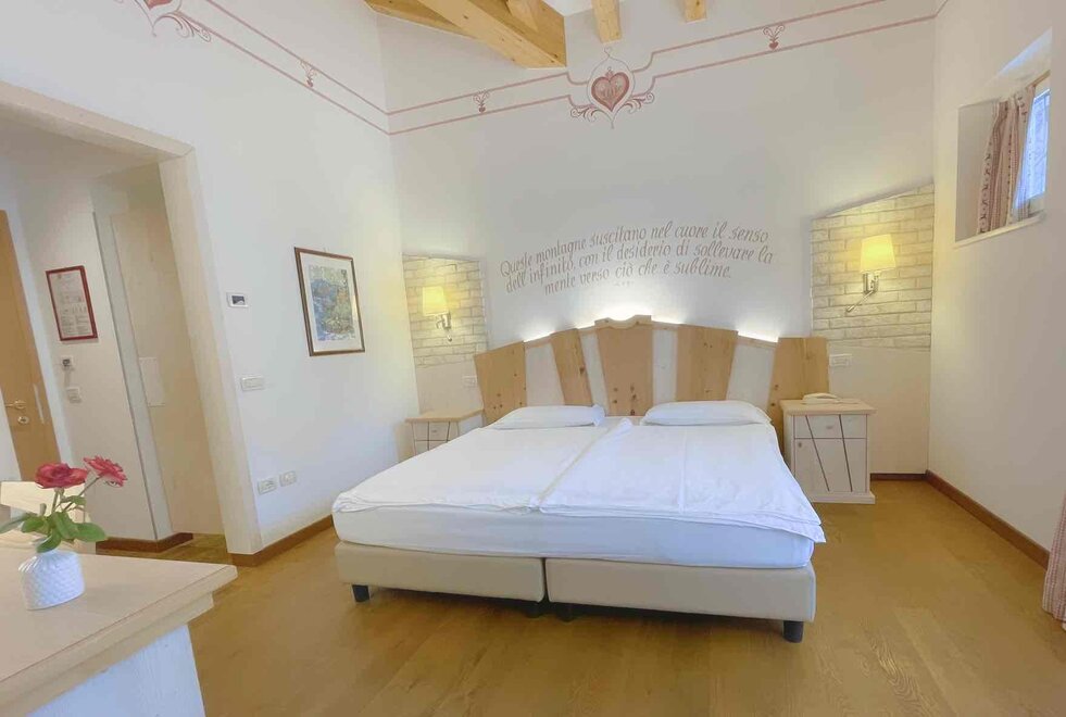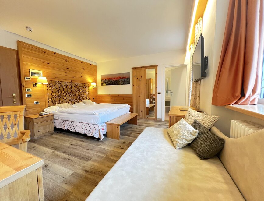 Brand new Junior Suite with two balconies with panoramic views of the Brenta Dolomites, bathroom with shower, 42-inch TV, mini bar, mezzanine lounge.