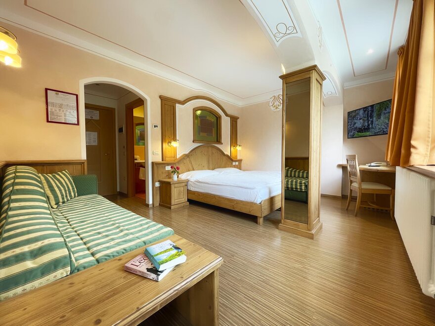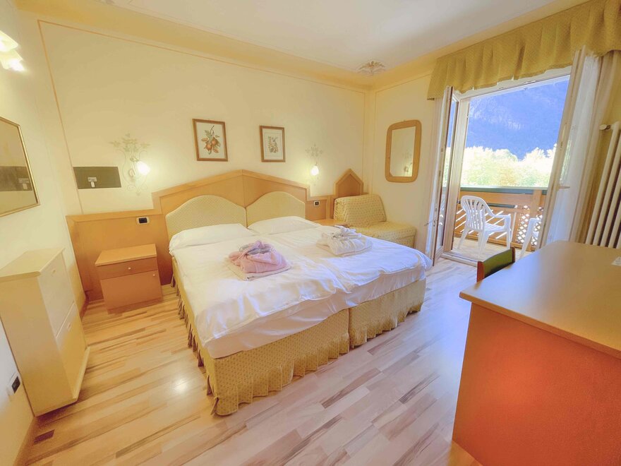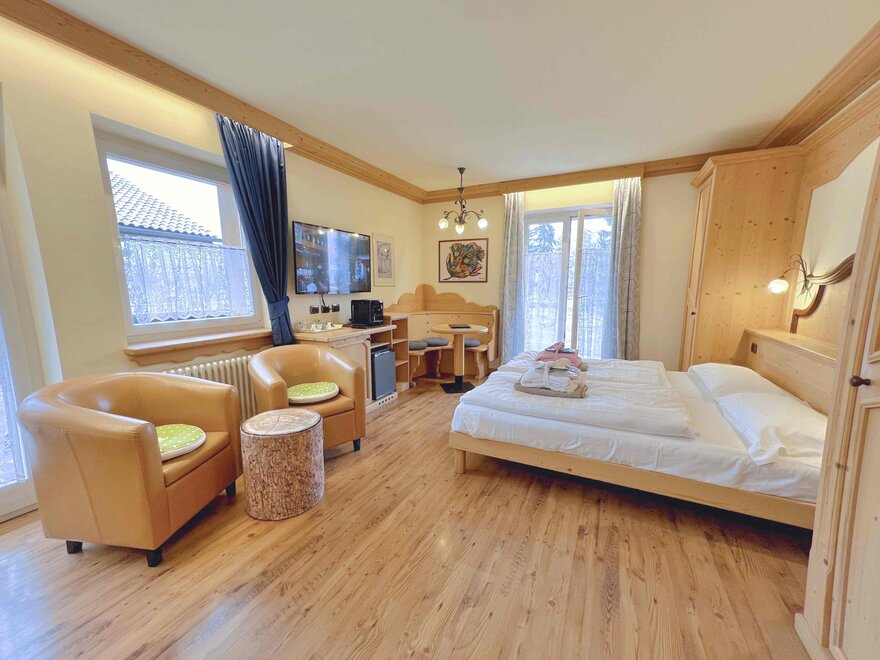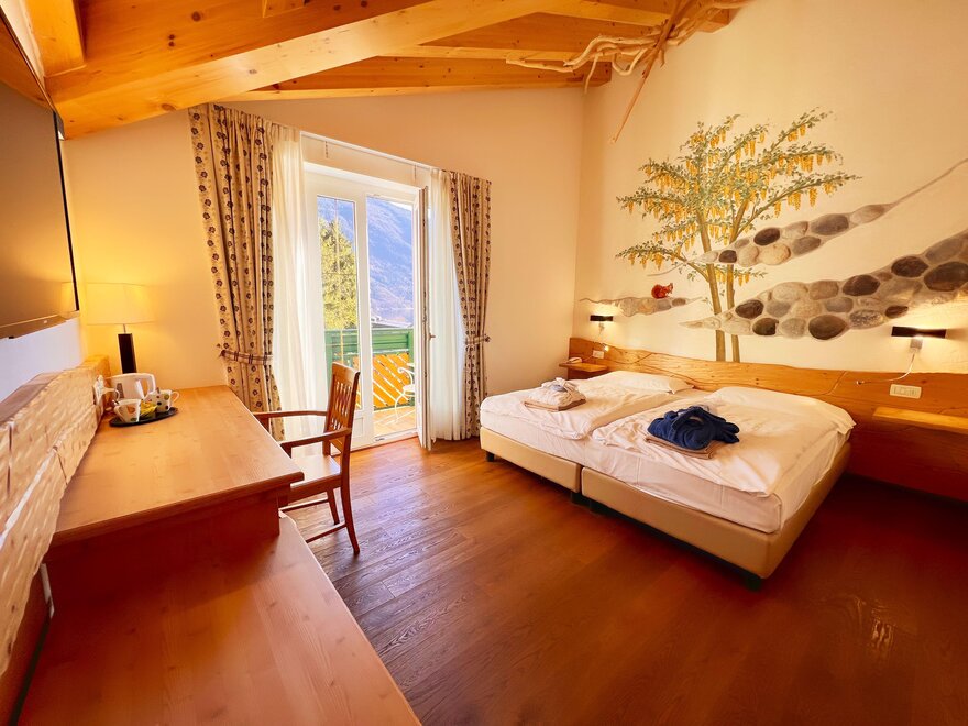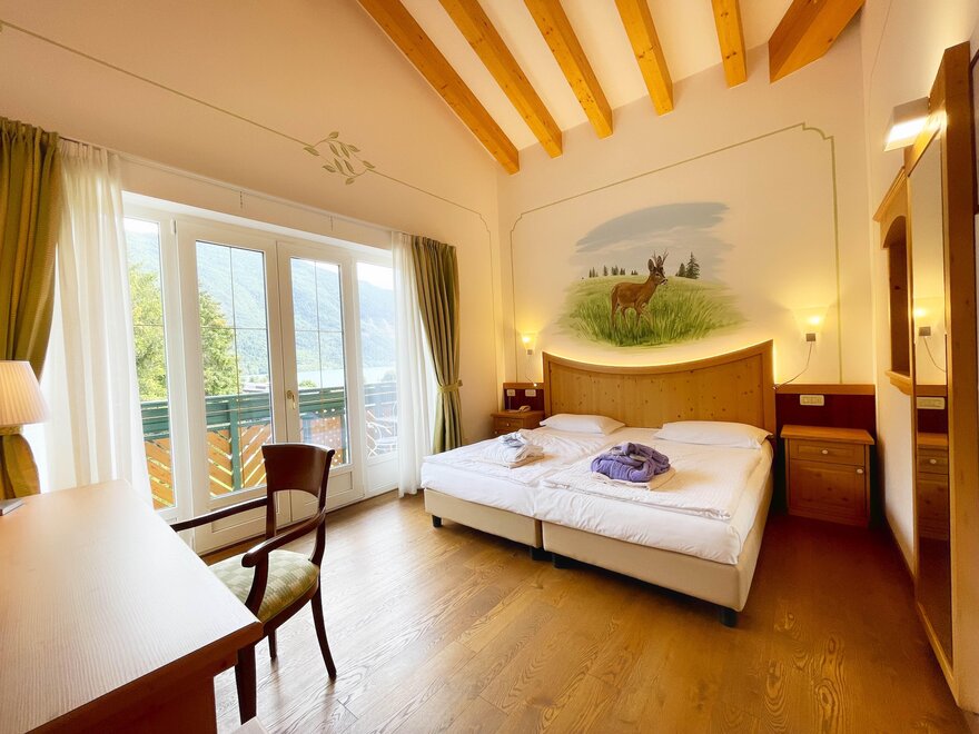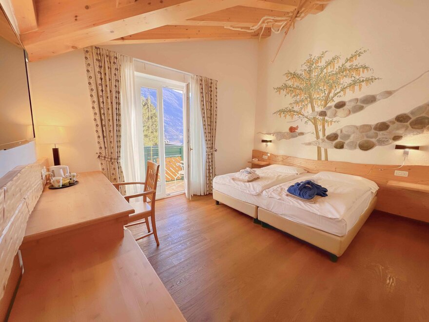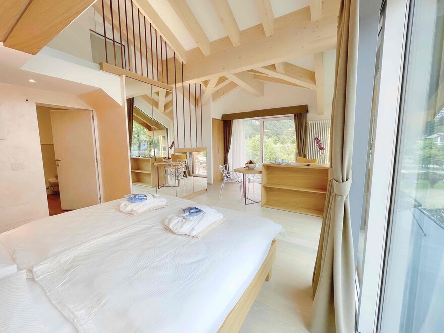 The rooms are perfect for families, as they consist of two adjoining rooms (approx. 40-50m²) and can accommodate 2 to 4 people. As well decorated with light wood, bright and welcoming. All the Junior Suite have a balcony or terrace, facing both the lake and towards the Brenta Dolomites... to enjoy the splendid 360 degrees panorama.