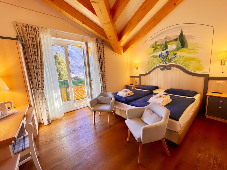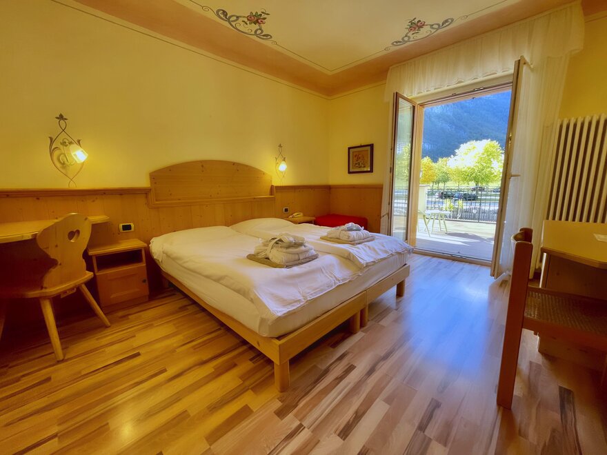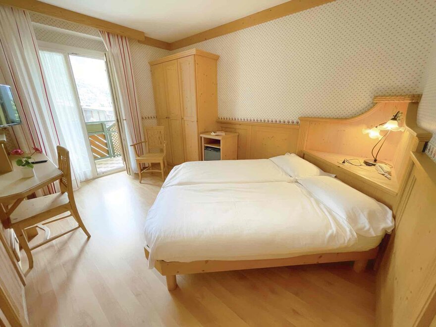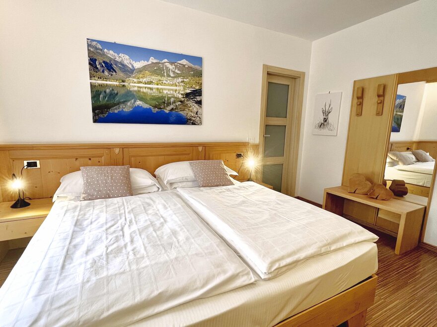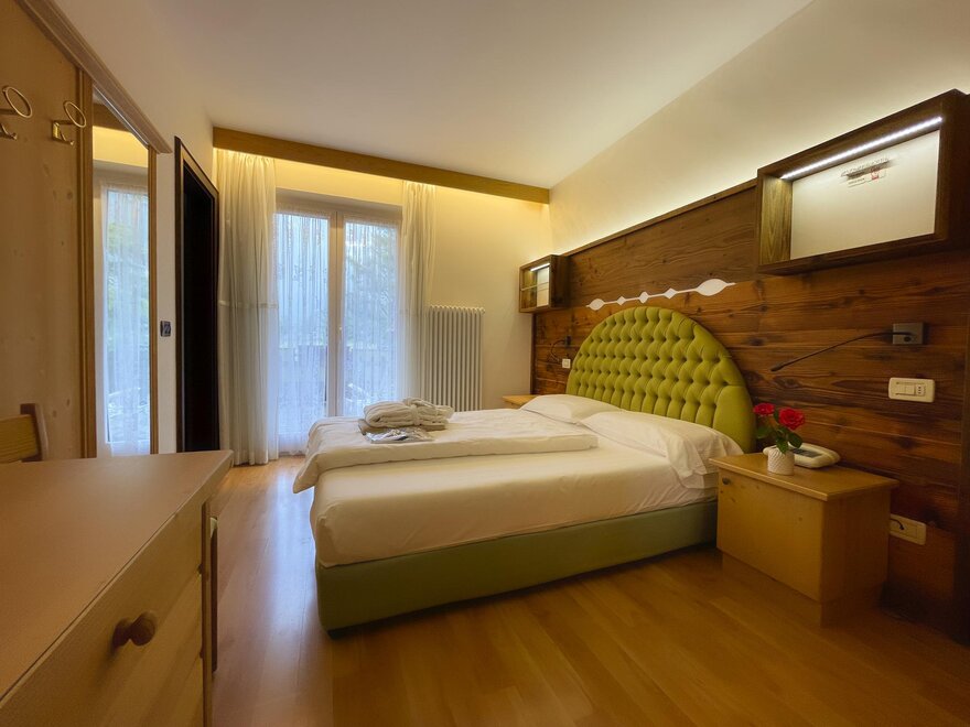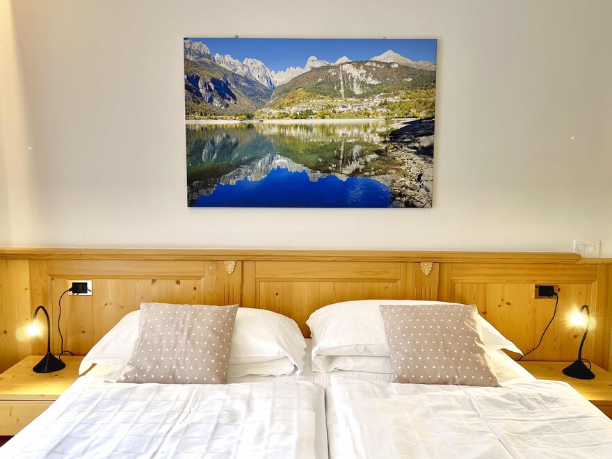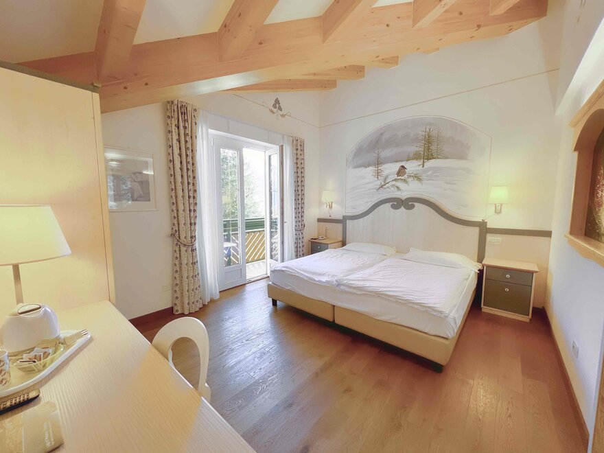 Imagine waking up in our Classic Double Room, a serene corner where every detail is designed for your well-being. The terrace, with a breathtaking view of the Dolomites, or the balcony partially overlooking the lake, invites you to pause and enjoy every single moment, both in the morning and at sunset. The bathroom with shower is designed to provide simple and refreshing pleasure, while the TV and mini bar complete the experience, adding that extra touch for your relaxation. Here, every space is created to make you feel at home, immersed in the beauty and comfort of the mountains.