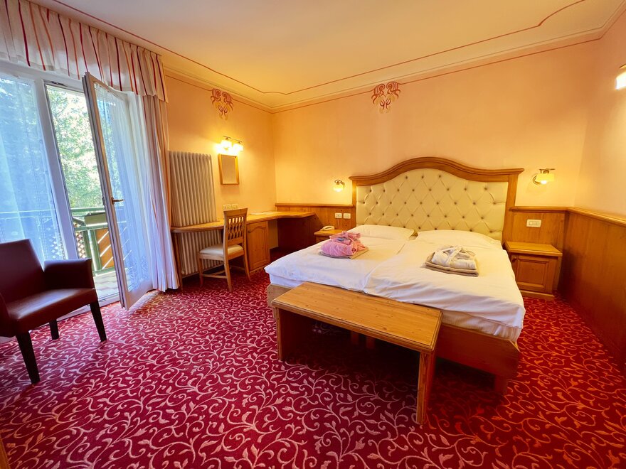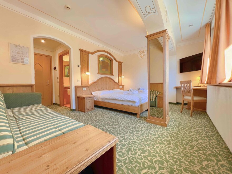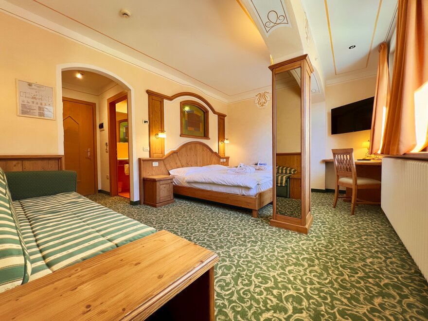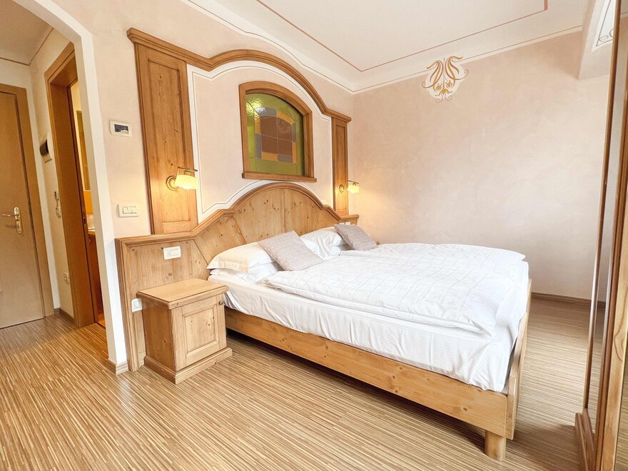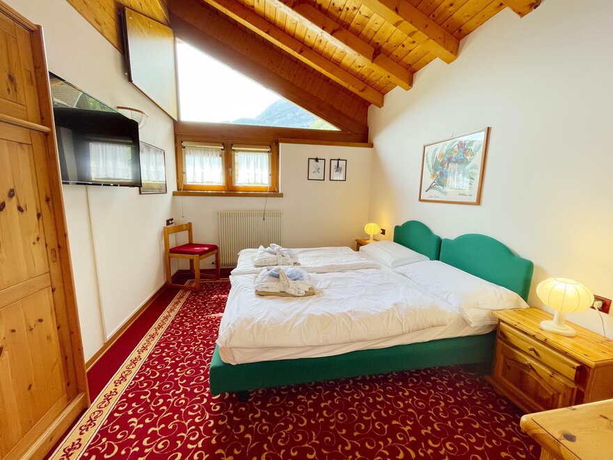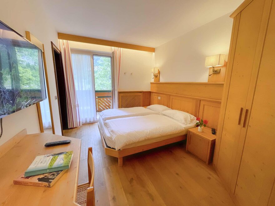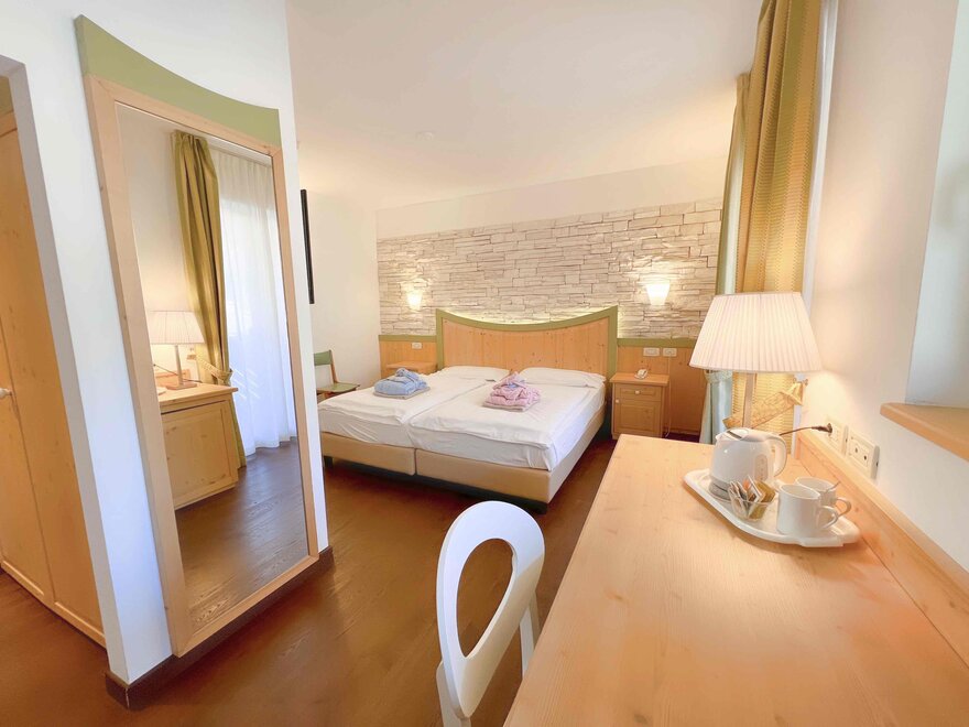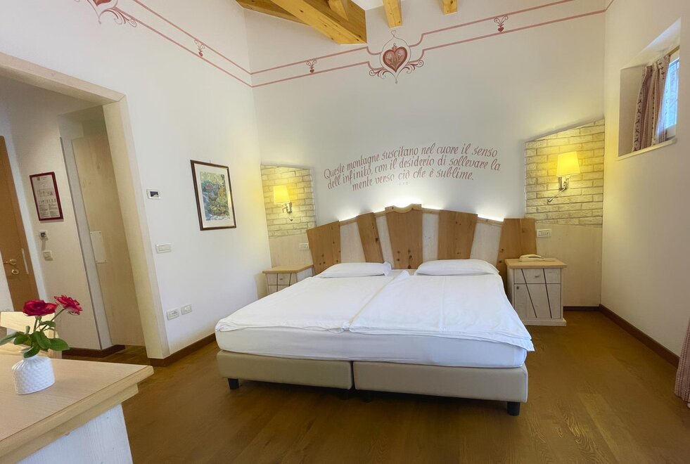 Imagine waking up in our Classic Double Room, a serene corner where every detail is designed for your well-being. The terrace, with a breathtaking view of the Dolomites, or the balcony partially overlooking the lake, invites you to pause and enjoy every single moment, both in the morning and at sunset. The bathroom with shower is designed to provide simple and refreshing pleasure, while the TV and mini bar complete the experience, adding that extra touch for your relaxation. Here, every space is created to make you feel at home, immersed in the beauty and comfort of the mountains.