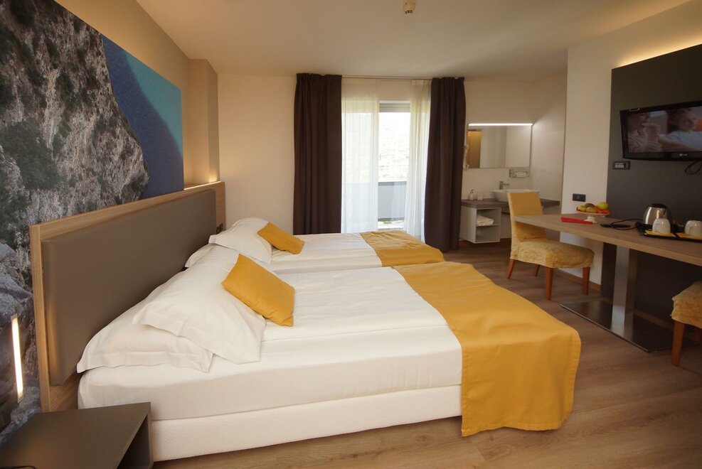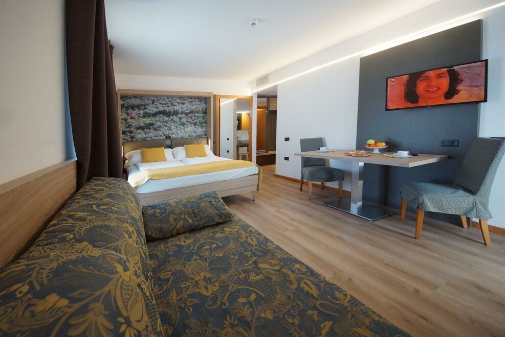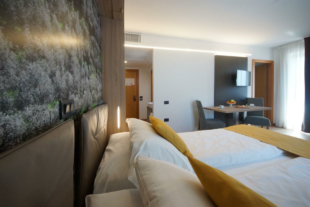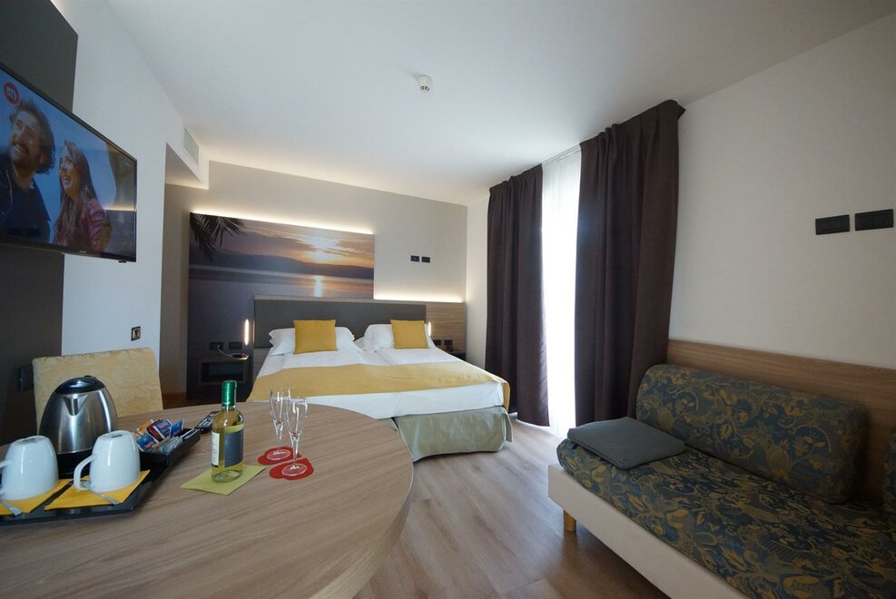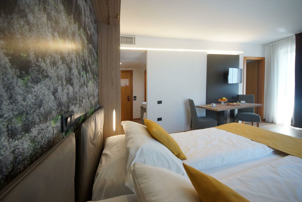 Deluxe room with double bed and one single bed or 3 single beds. Best position, best spaces and furnishings, private bathroom with bath tub or shower, hair dryer, bathrobes, air conditioning, safe, mini-bar (or full kitchen), welcome gift, telephone, satellite TV, internet access, courtesy bike and possibility of whirlpool (with surcharge).