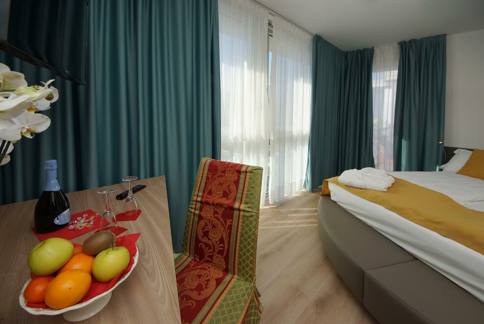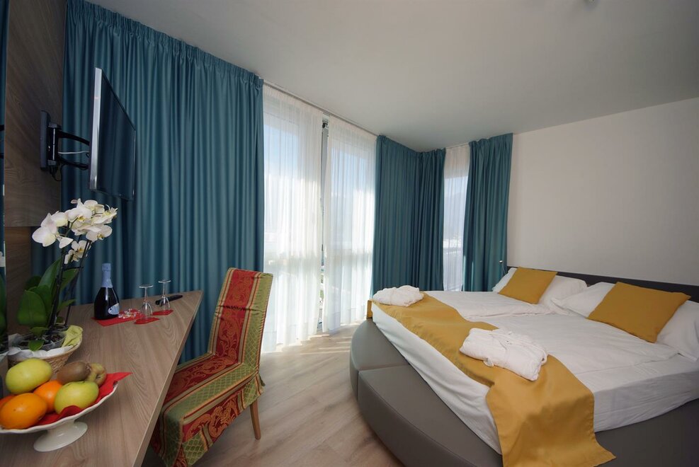 Deluxe room with double bed or two single beds. Best position, best spaces and furnishings, private bathroom with bath tub or shower, hair dryer, bathrobes, air conditioning, safe, mini-bar (or full kitchen), welcome gift, telephone, satellite TV, balcony, internet access, courtesy bike and possibility of whirlpool (with surcharge).