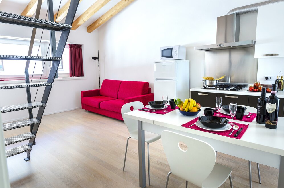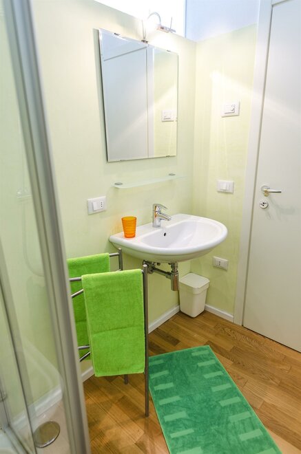 Located on the second floor, the Green Apartment is provided with a spacious wooden terrace. It features a fully equipped kitchen, a bright living-room with pull-out couch, shower in the bathroom, large closet in the bedroom and soundproof windows.