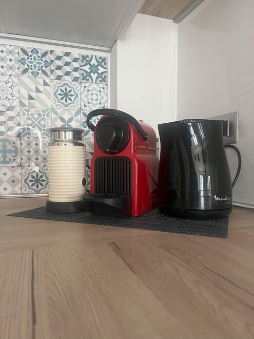 a kettle, Nespresso machine with pods, all basic utensils, and pantry staples like oil, sugar, salt, and coffee.
