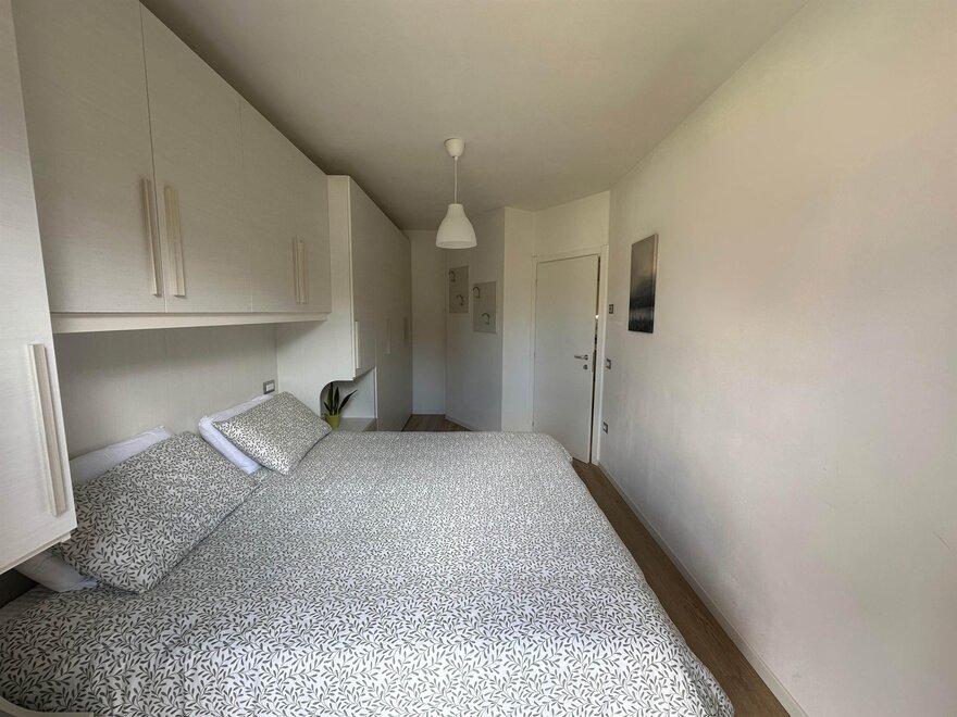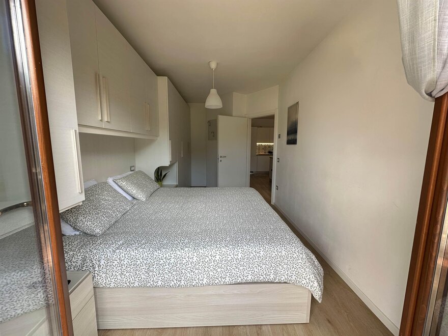 The balcony overlooks a quiet, green inner courtyard — a peaceful spot to relax. You can access it from both the kitchen and the bedroom.