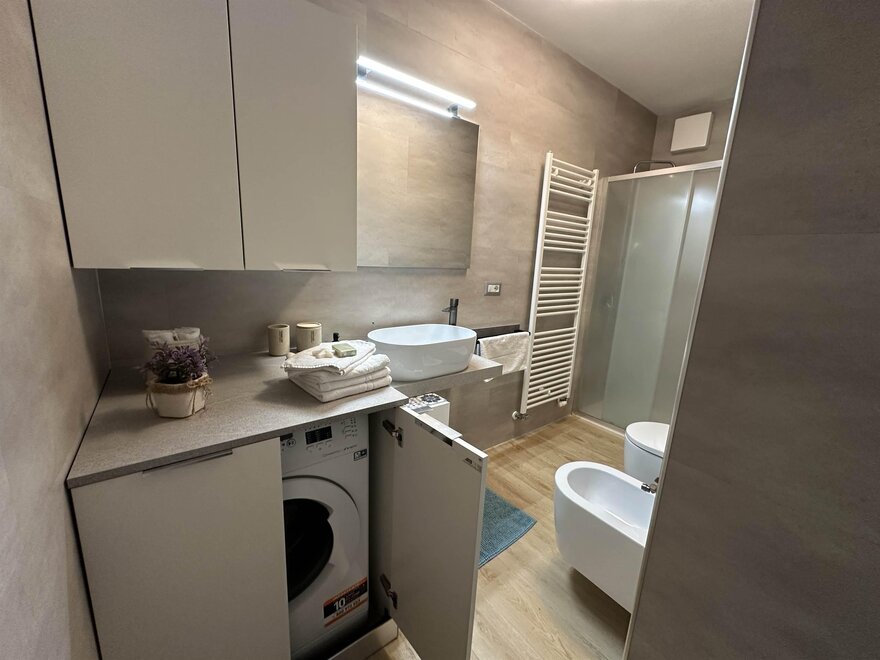 There’s also a dishwasher.The bathroom is functional and comfortable, with a shower and washing machine.