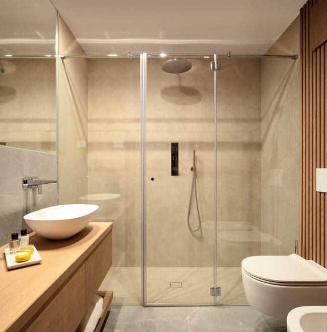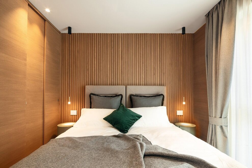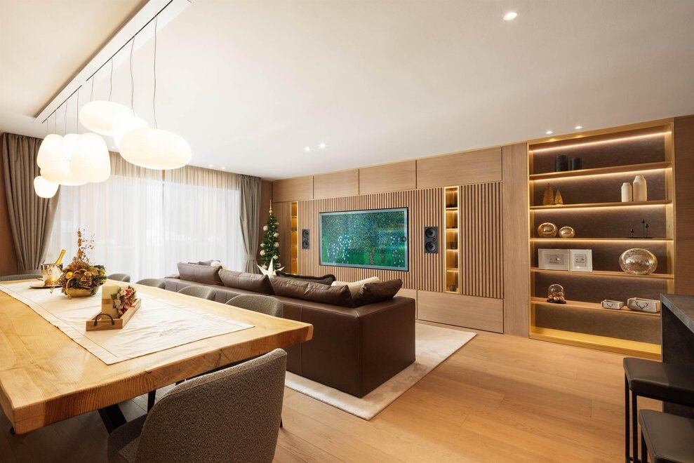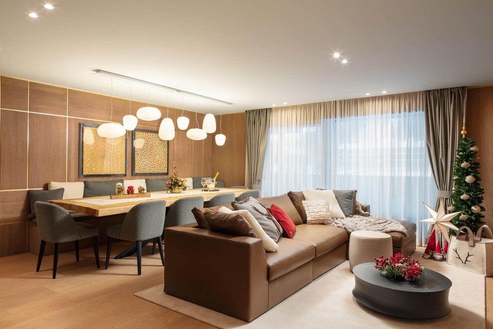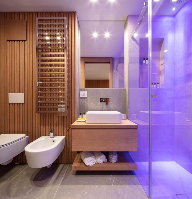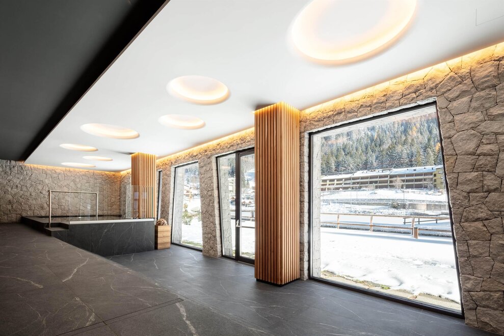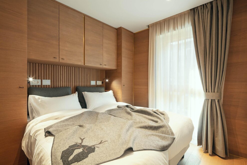 Make the most of the mountains in our welcoming Nardis apartment, located in the new “Campiglio WOOD” residence, a short distance from the centre in a fabulous natural setting. The Nardis apartment can accommodate up to 6 people and consists of a welcoming living room with kitchen diner that looks out onto the Conca Verde, decorated with custom-made wood panelling with brass inserts. The night- time area is made up of a master bedroom with ensuite bathroom, a second bedroom with private bathroom, a third smaller bedroom and a WC. The east-west orientation ensures the apartment is bathed in natural light all day and enables guests to enjoy the tranquillity of the lake thanks to the large living room balcony and a view of the streets of the town centre, which offers all of the basic shops and services they might require. The Nardis apartment is equipped with all mod cons necessary to guarantee an unforgettable holiday: custom-made furniture with a rustic mountain feel combined with items of modern designer decor from the best Italian brands. The property is equipped with high-quality and functional home accessories to make sure you feel right at home. It is also possible to use the onsite parking spaces as well as the numerous condominium services, such as the Wellness Area, the Fitness Room, the Ski Room and the Bike Room, free of charge. The assistance of a Roseto Hospitality Manager, who will provide support from the information request stage through to the end of their holiday, will enable individual guests to personalise their experience as far as possible according to their needs and interests.