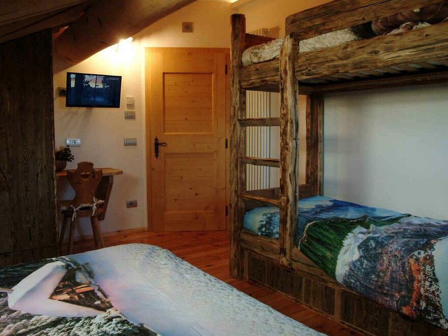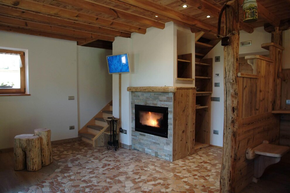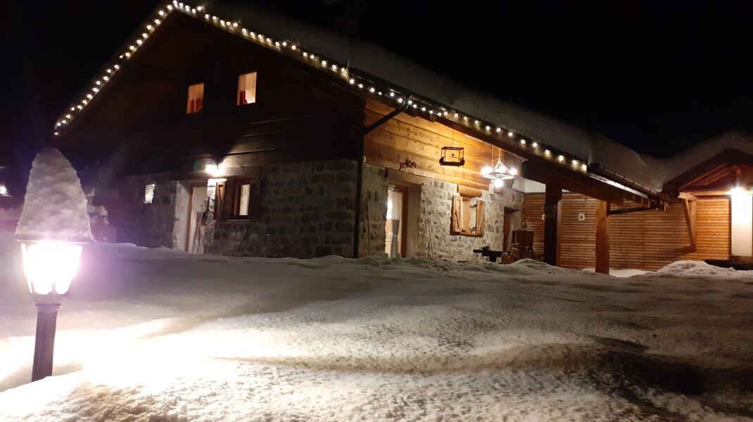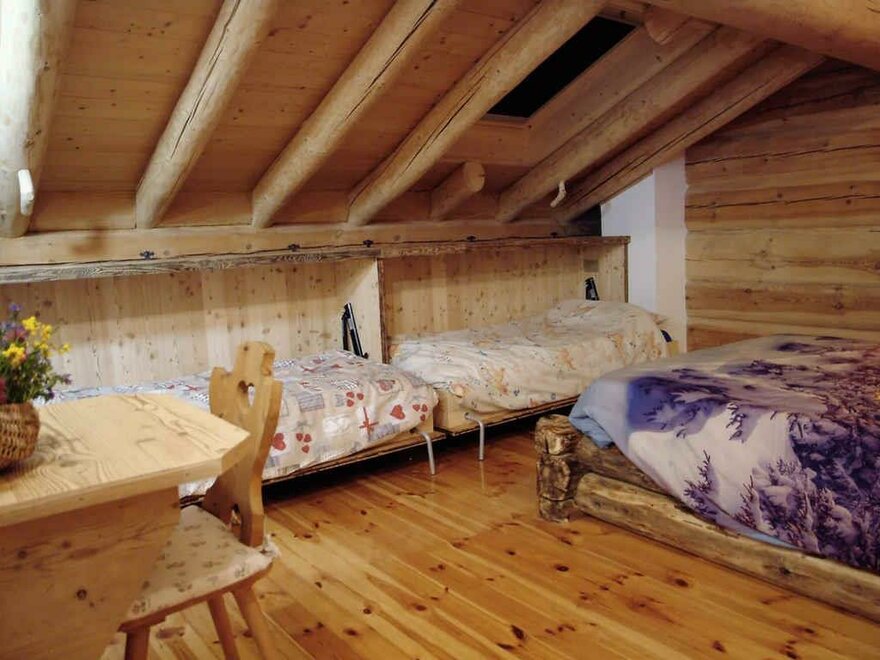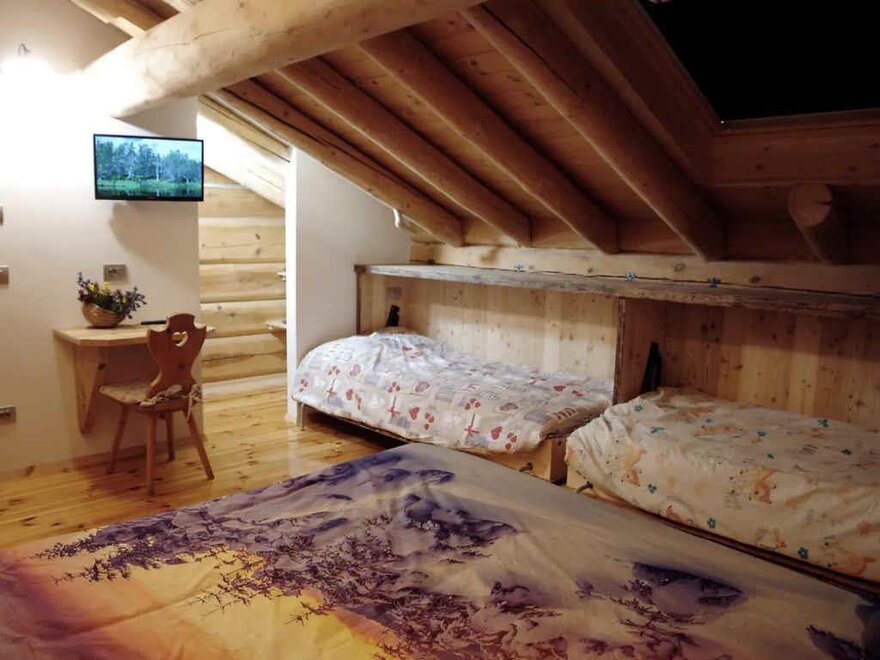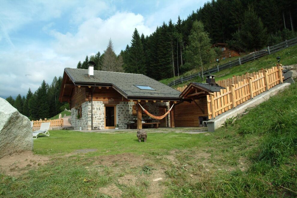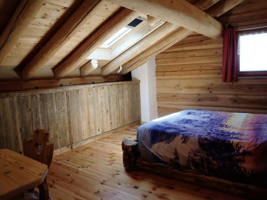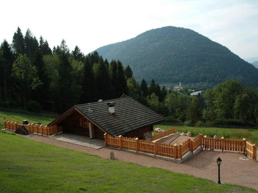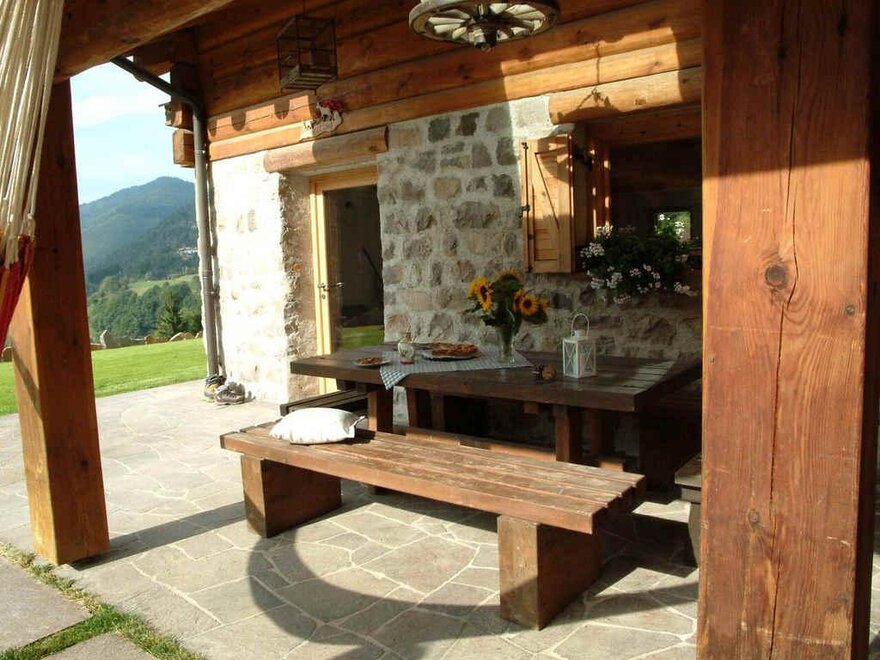 The chalet is in typical mountain styel, characterized by stone and log walls and wooden interiors. It is built on two floors for a total square footage of about 87 square meters. On the groumd floor you will find all in an open space: the kitchen, the lunchroom and the livingroom. If you go down 3 steps you will reach the bathroom and the wellneas area, while on the first floor there is the sleeping area. Baita Nonno Ghino can accomodate a maximun of 8 people; children untill 14 years old do not pay. As for our dog friends, they are welcome as long as they do not access the sleeping area, the bathroom, nor the wellness area. You can easily reach the structure by car, parking just before the garden shown in the photo. The chalet is sorrounded by a wide unfenced garden, with a confortable wood-burning barbecue, a terrace where you can eat outside with a big table and benches.