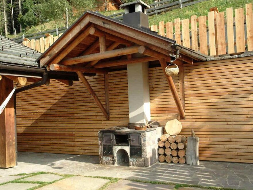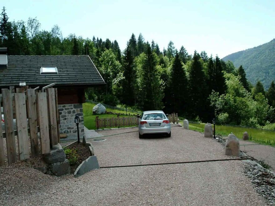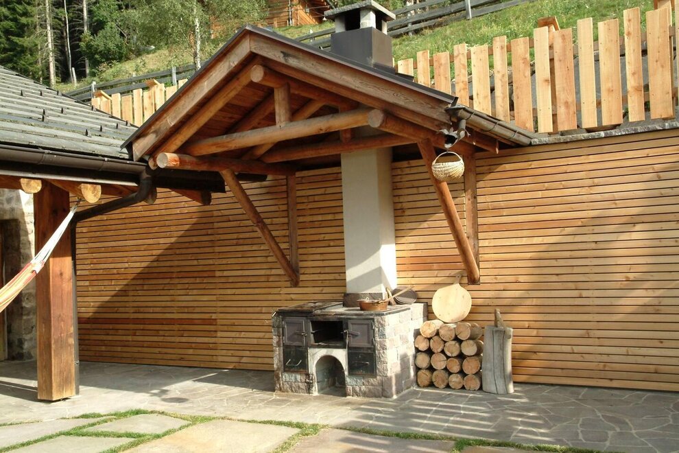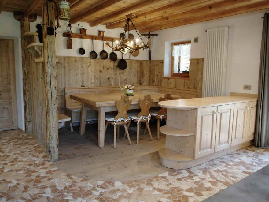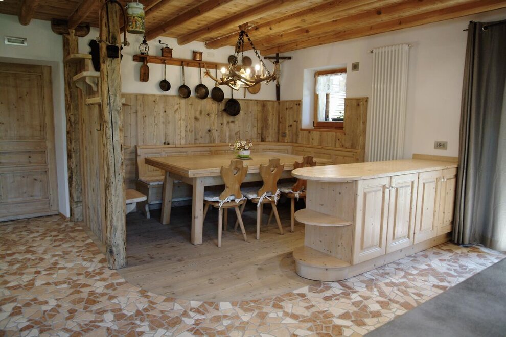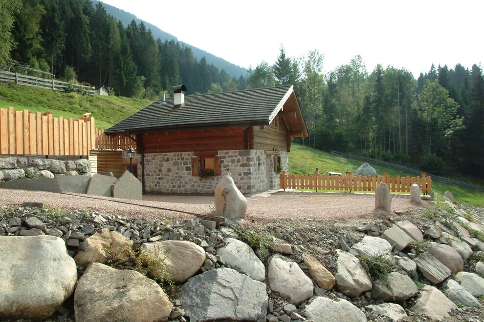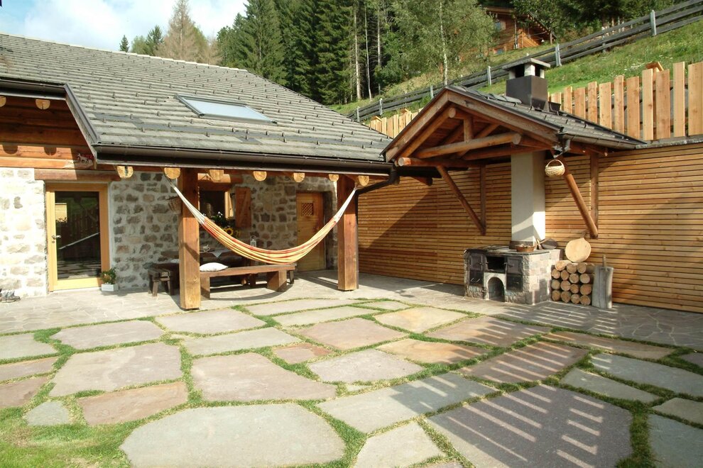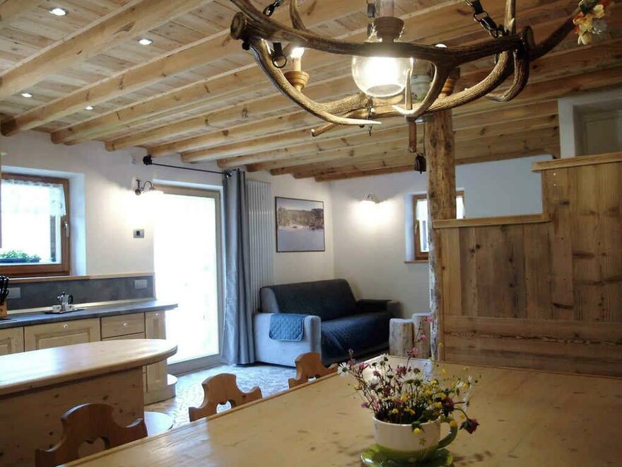 The chalet is in typical mountain styel, characterized by stone and log walls and wooden interiors. It is built on two floors for a total square footage of about 87 square meters. On the groumd floor you will find all in an open space: the kitchen, the lunchroom and the livingroom. If you go down 3 steps you will reach the bathroom and the wellneas area, while on the first floor there is the sleeping area. Baita Nonno Ghino can accomodate a maximun of 8 people; children untill 14 years old do not pay. As for our dog friends, they are welcome as long as they do not access the sleeping area, the bathroom, nor the wellness area. You can easily reach the structure by car, parking just before the garden shown in the photo. The chalet is sorrounded by a wide unfenced garden, with a confortable wood-burning barbecue, a terrace where you can eat outside with a big table and benches.