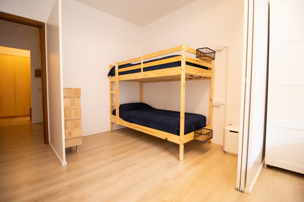 On the ground floor you’ll find a fully equipped kitchen (dishwasher, microwave, coffee machine), a living space with sofa bed, TV and dining table; the sleeping area includes a double bed plus bunk bed and a privacy partition.