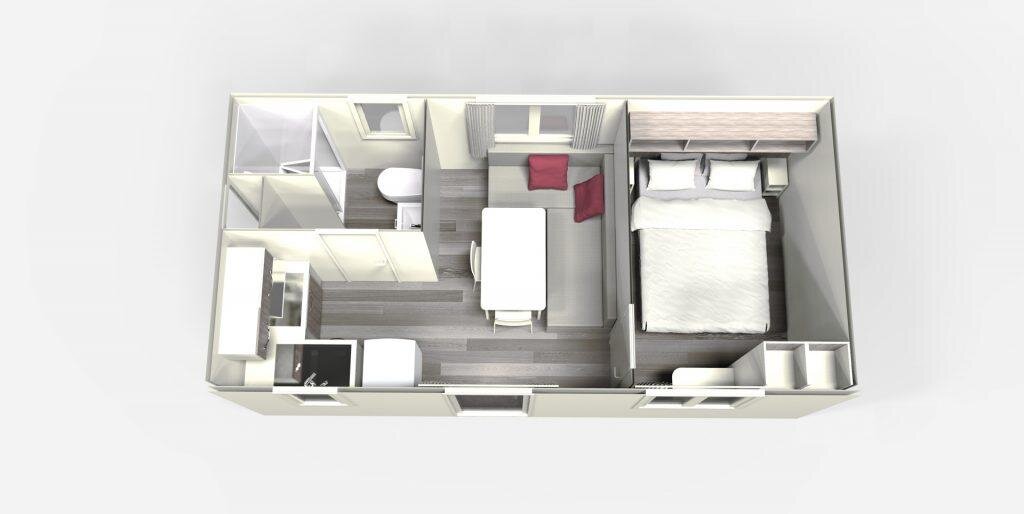Our Mobile Houses have an area of 24 sqm and can accommodate two to four people. They consist of a double bedroom with shelves and wardrobe, a living room, kitchenette, bathroom with shower, toilet and bidet, and an external veranda. They are equipped with heating.