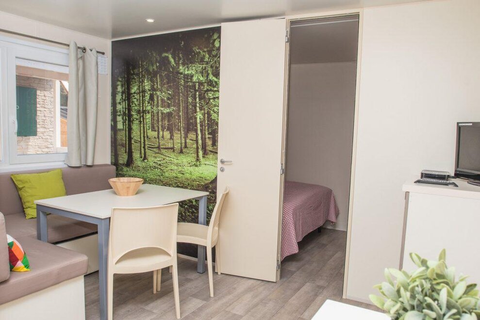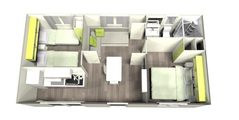 The Family Mobile Home measures 32 square meters and can accommodate five to seven people, a convenient solution for a family with children or a group of friends. With a modern and lively design, it has two bedrooms with wardrobes and shelves, one with a double bed and the other with three single beds. In the bright living room, the corner sofa transforms into a double sofa bed. It is completed by a table with four seats and a cabinet with TV-sat.
