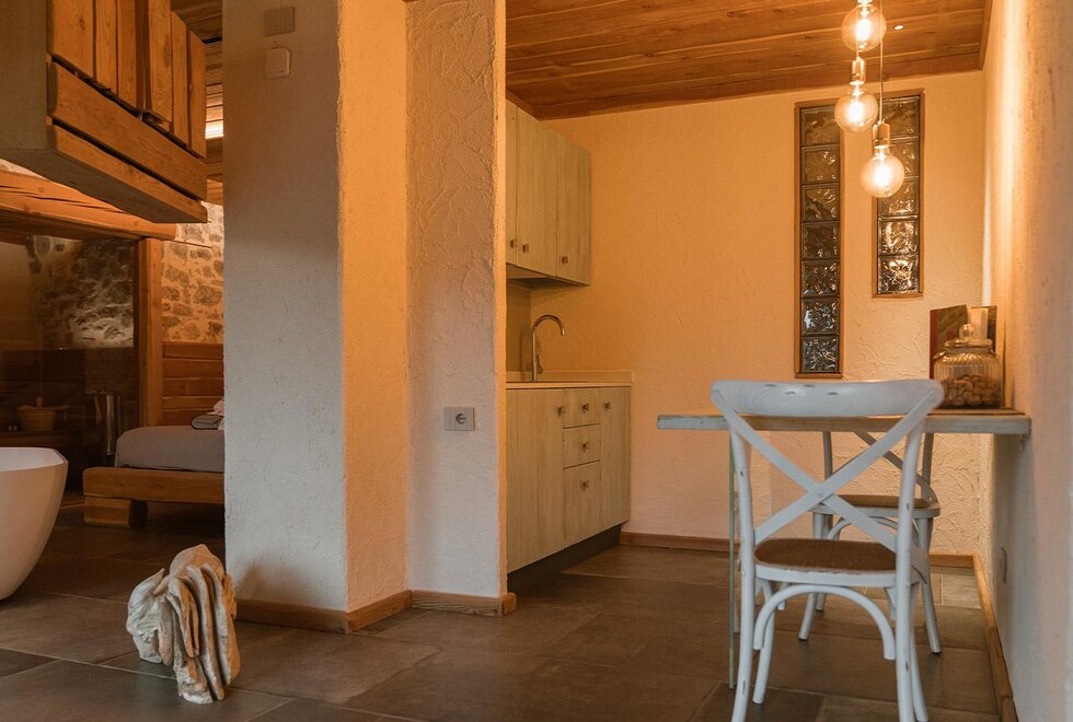 Large studio apartment with entrance on the ground floor, in a rustic and elegant style with stone and exposed beams. The living room with sofa bed has a small separate kitchen area. In the sleeping space, there is a private sauna tub and shower. Full bathroom. A beautiful private garden with chairs and table.