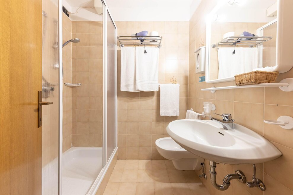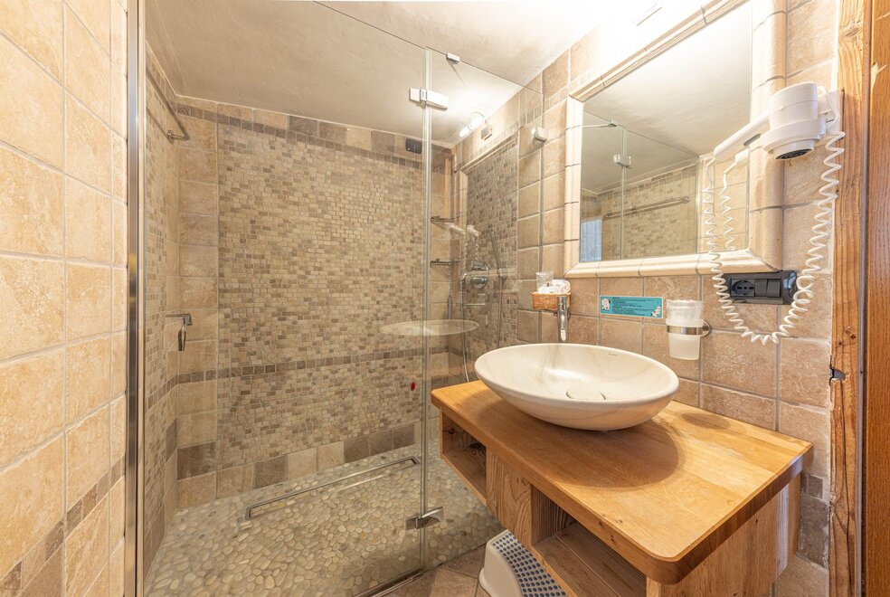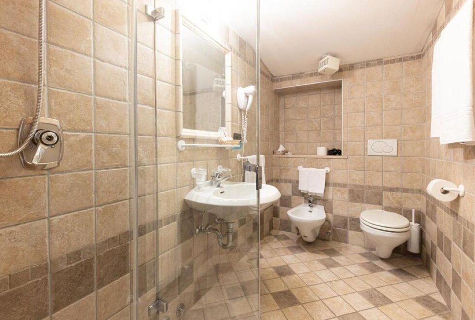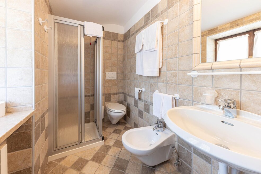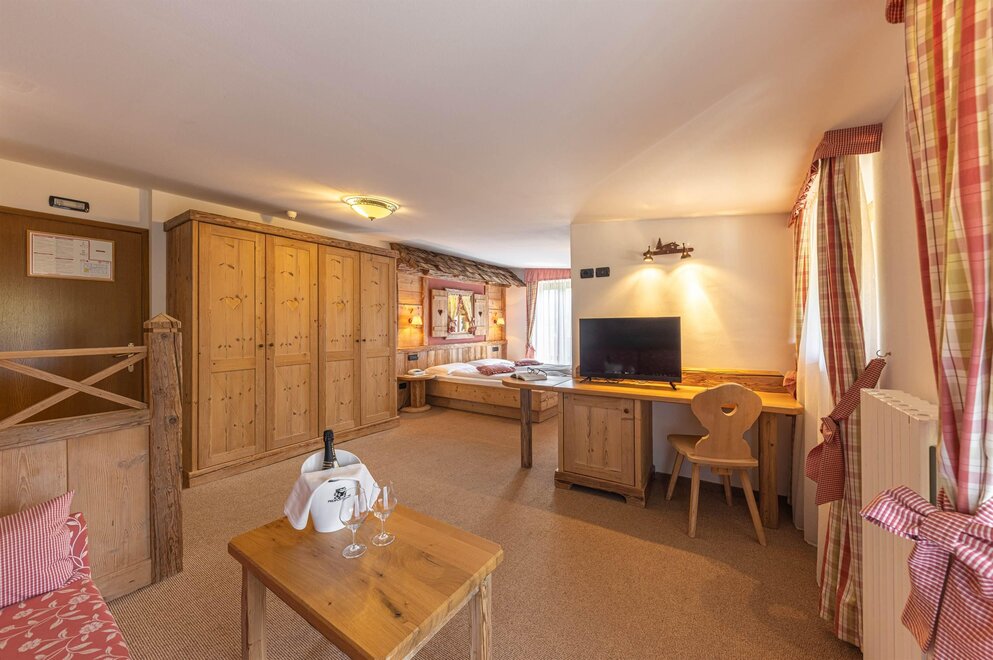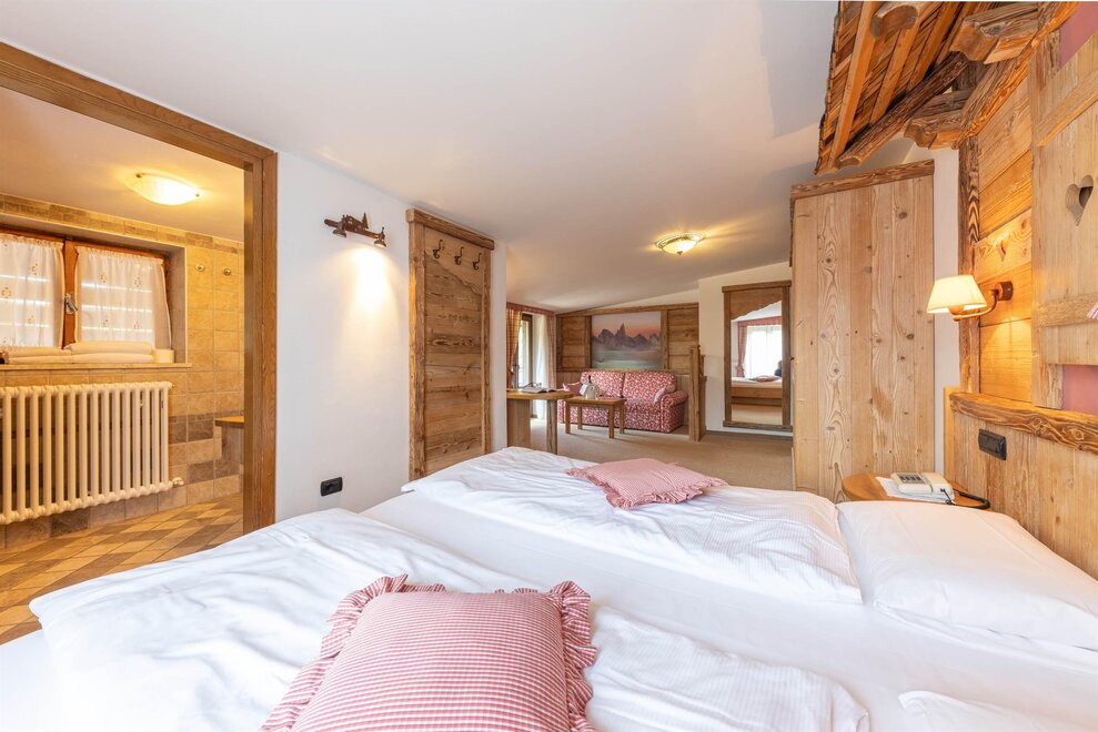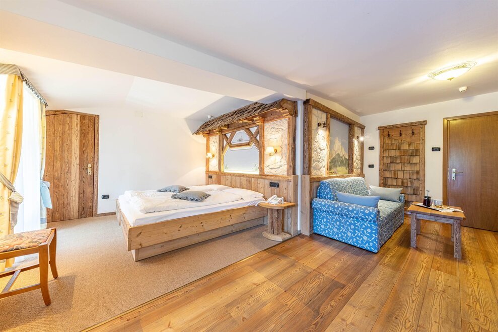 Large and bright rooms with wooden ceilings and boxes or soft carpet. Furnished in light wood and equipped with a comfortable sofa which becomes a bed if necessary. Equipped with private bathroom with shower and hairdryer, direct dial telephone, LCD TV, safe, small fridge available, Wifi connection and private balcony. Possibility of having connecting rooms.