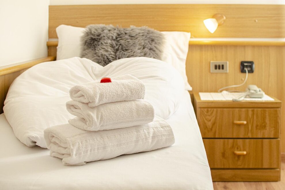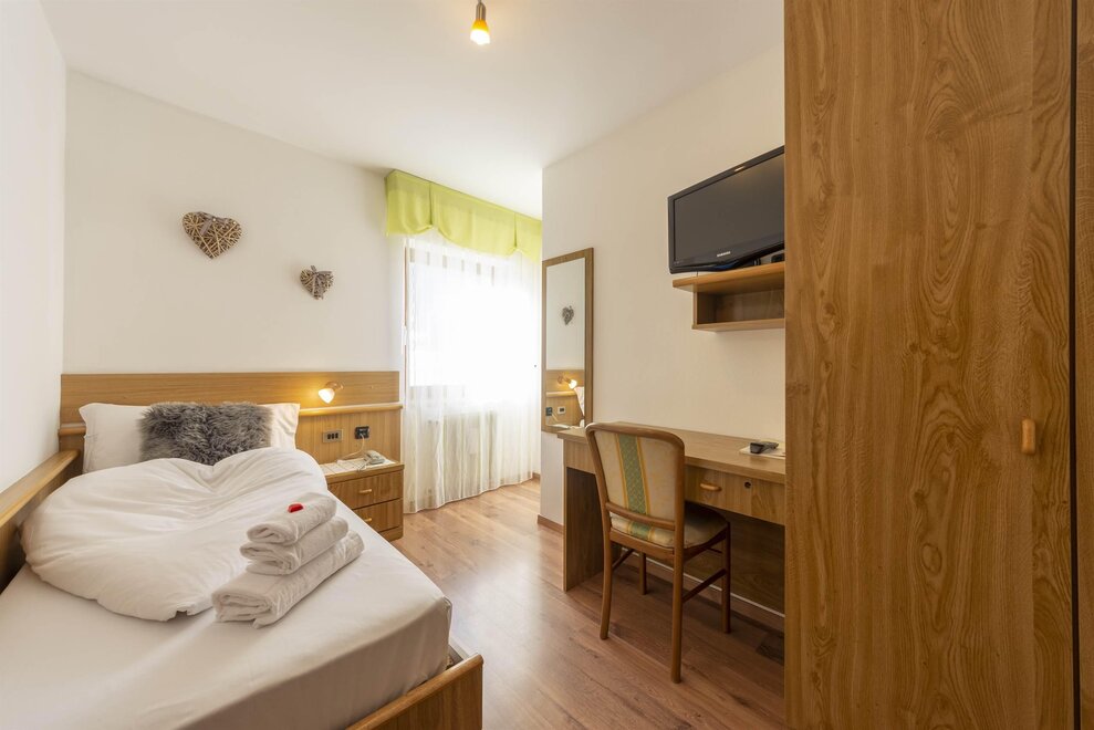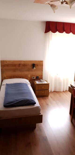 our single rooms are comfortably furnished with wooden parquet, do not have a balcony but also a window in the bathroom. They are equipped with TV, safe, wi-fi, private bathroom with hairdryer and courtesy set.