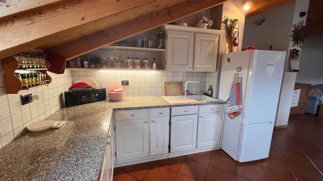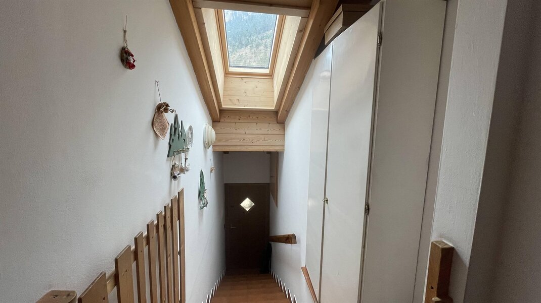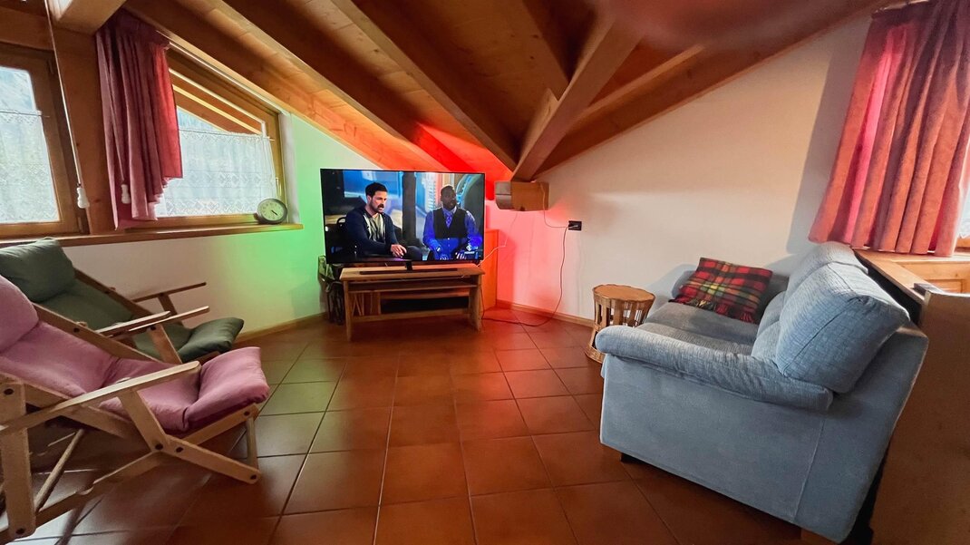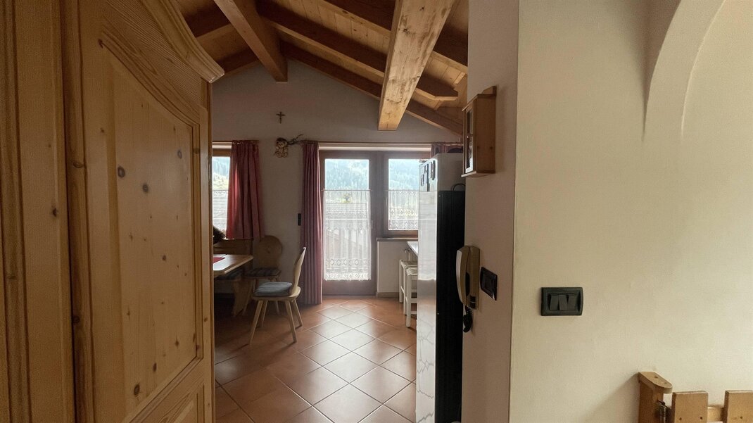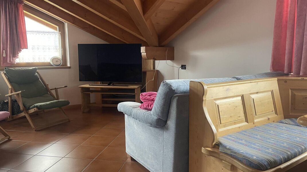 Located in a quiet area, about a 10–15 minute walk from the center of Ziano di Fiemme, this attic apartment with its warm wooden ceiling combines modern comforts and a mountain atmosphere. It is situated on the second floor of a small building and welcomes guests with a bright living-kitchen area, ideal for relaxing after a day spent outdoors.