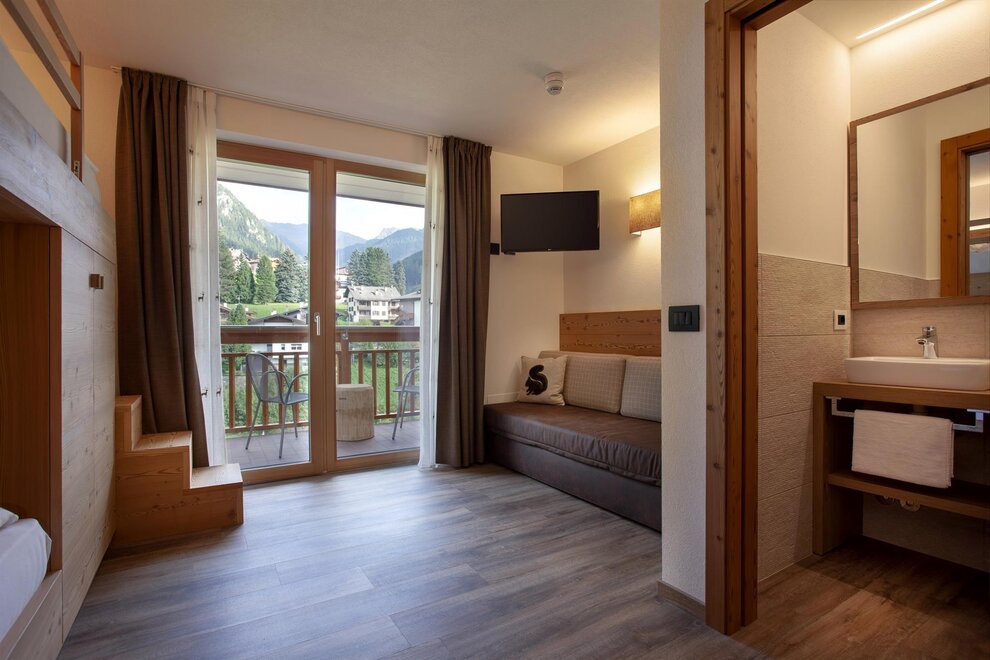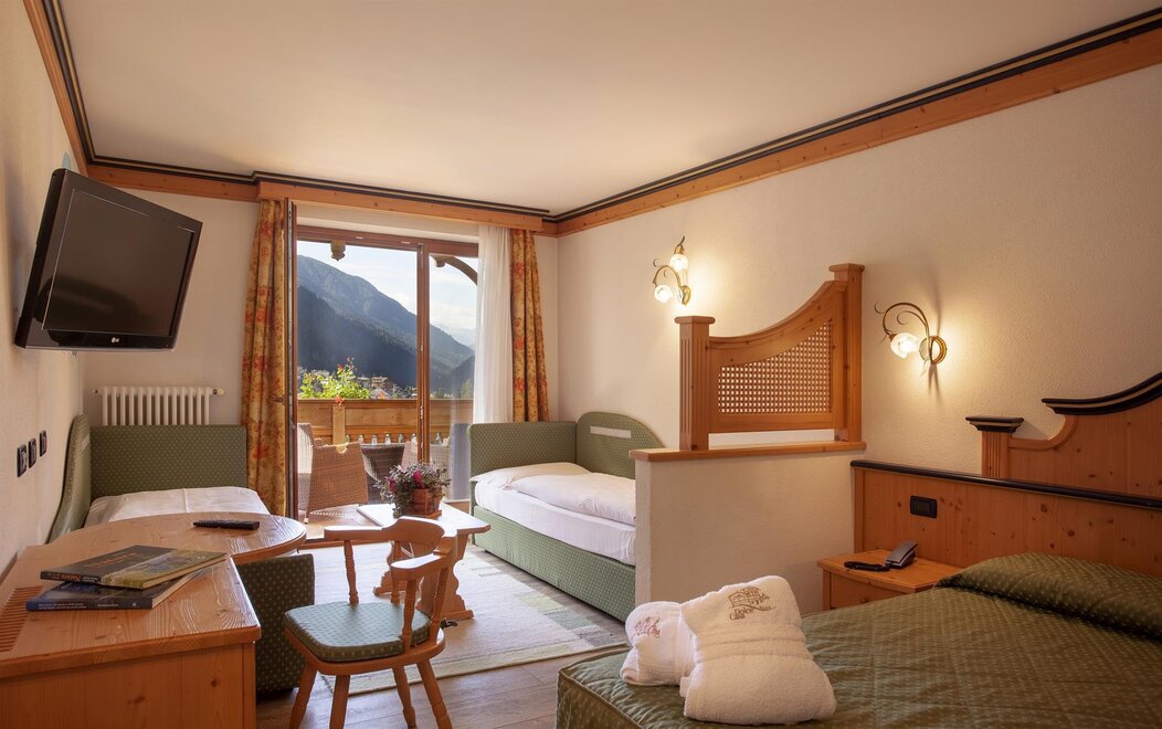 Family rooms of 28-30 square meters. with parquet composed of double bed with 3rd and 4th bed and possibility to add a camping cot. Equipped with a large private bathroom with hairdryer and magnifying mirror. Also safe, minibar, LCD TV, balcony or balcony. A good part with a panoramic view of the village of Moena.