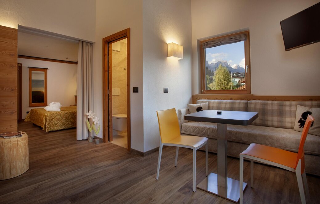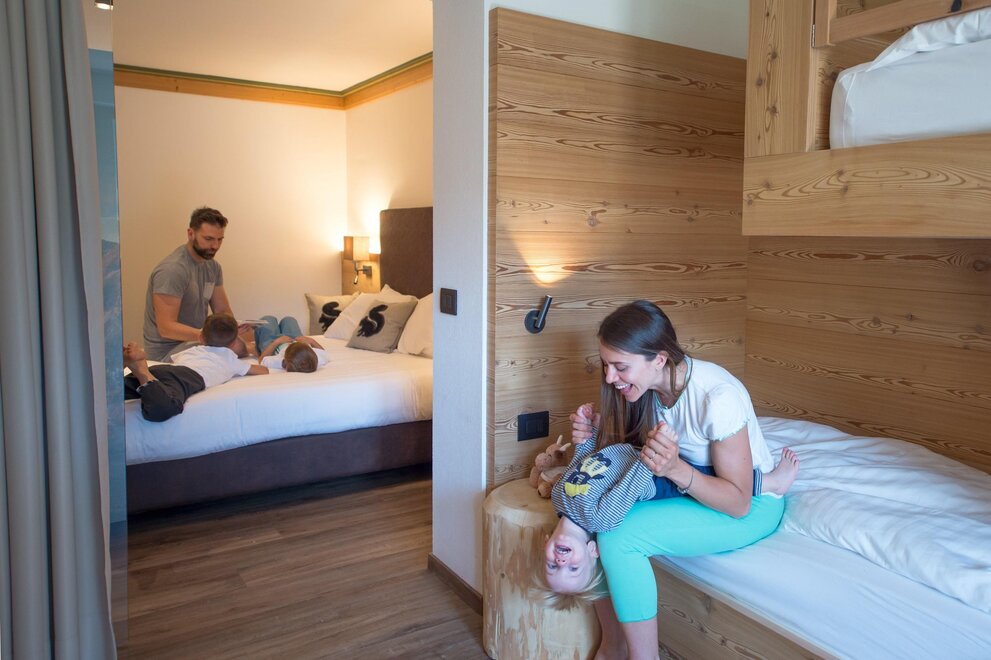 Family room of 60 square meters. with parquet composed of a Family Suite Dolomiti and a Classic connected by an entrance corridor. Equipped with 3 complete bathrooms, 3 LCD TVs, mini-bar, safe, hairdryer, magnifying mirror, 1 panoramic balcony and 1 small balcony.