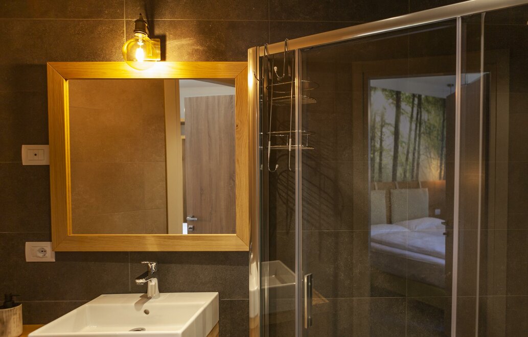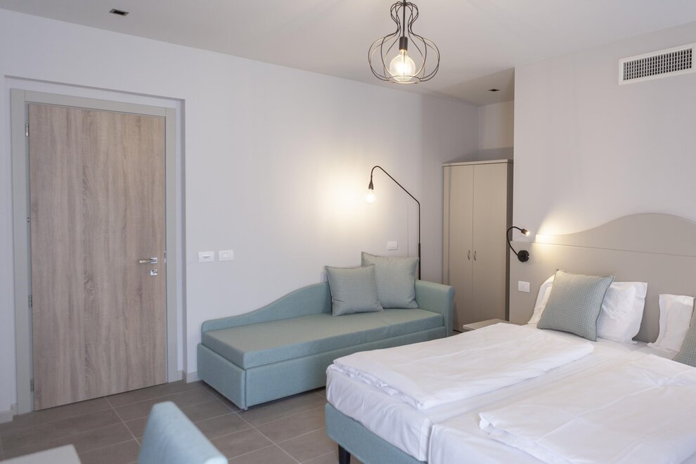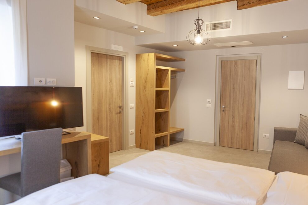 Spacious family rooms with an area of 14-16 sqm, consisting of a "queen-size" bed (1.80 m wide) and a third bed. They have a private bathroom, are furnished with "shabby" solid fir wood and offer Wi-Fi, phone, satellite TV, safe, and hairdryer.