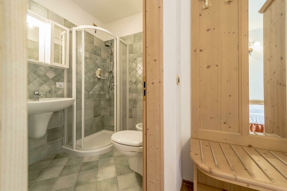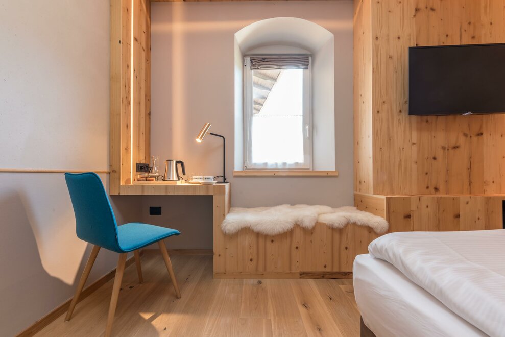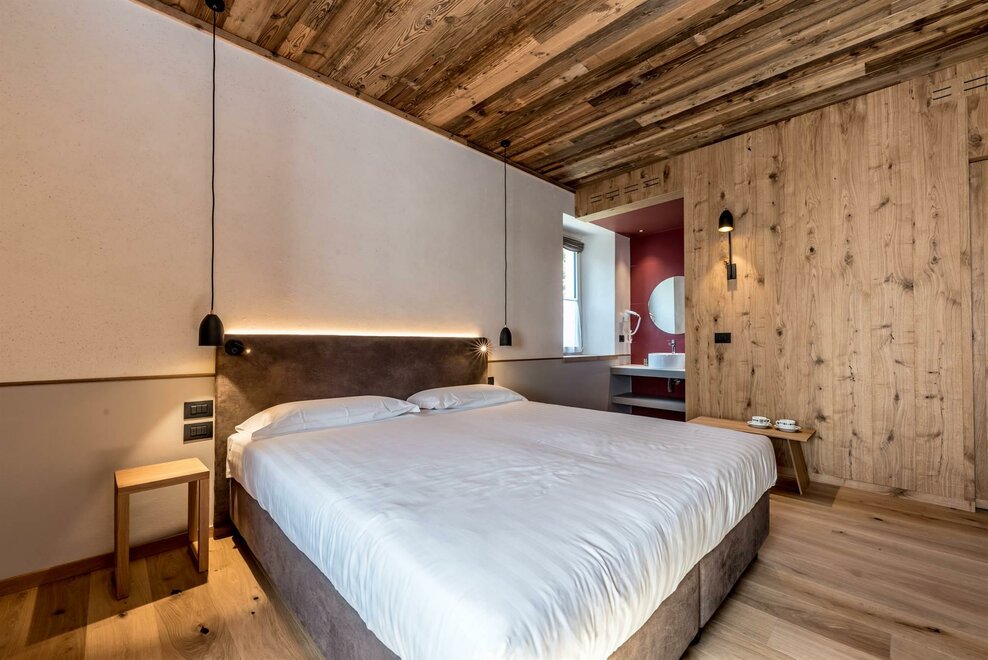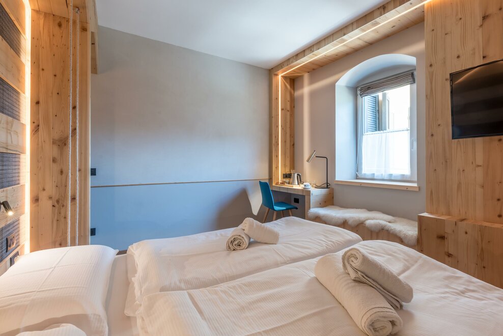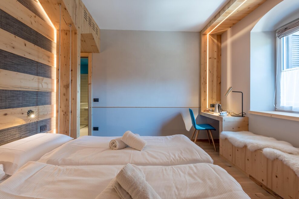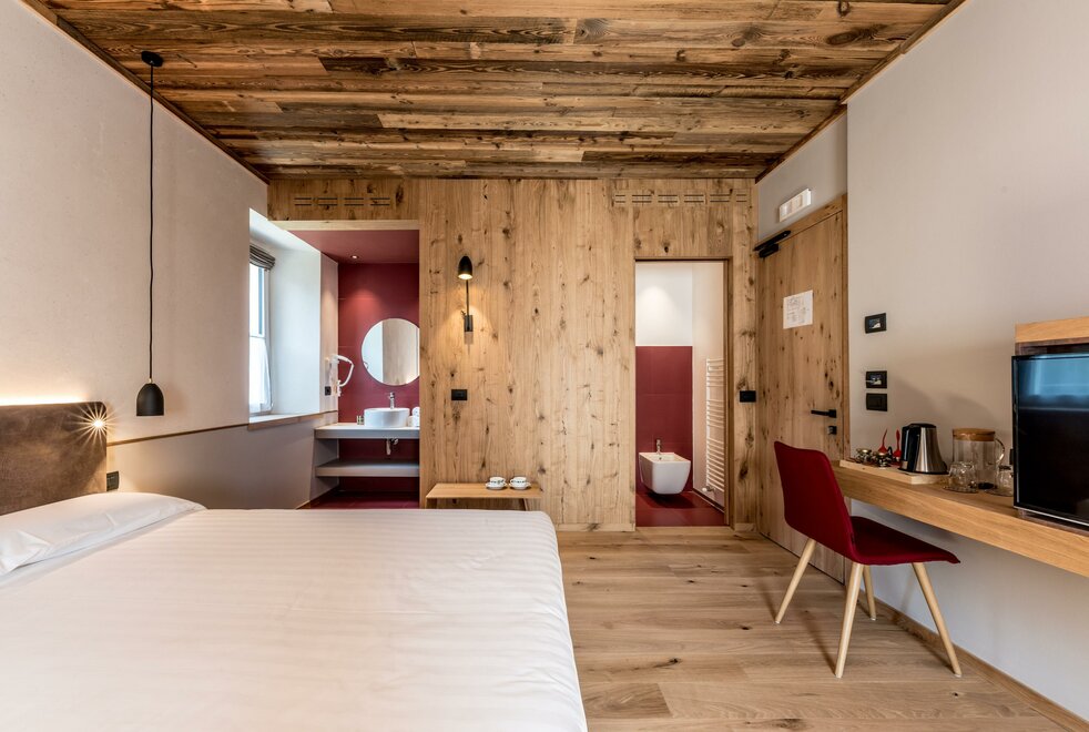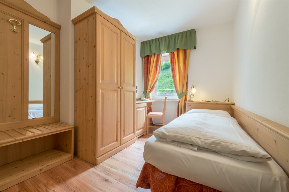 single room decorated with fir wood, wood parquet, programmable in-room heating, security box, minibar, sat. TV, Internet connection, bathroom with Wc, bidet, shower, hairdryer and soft duvet.
