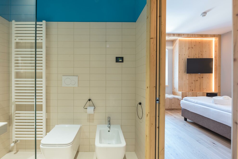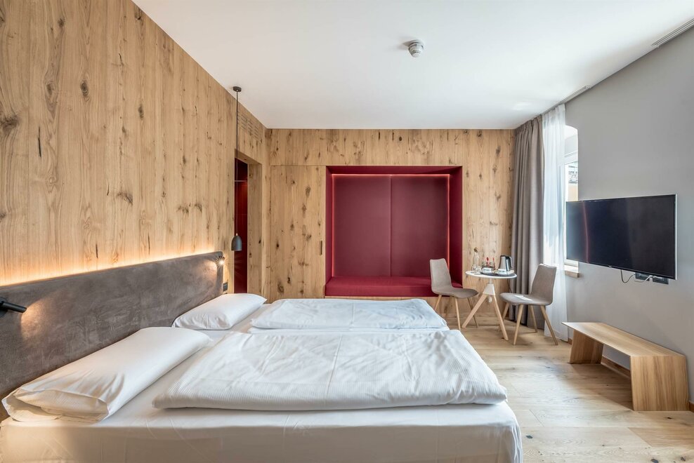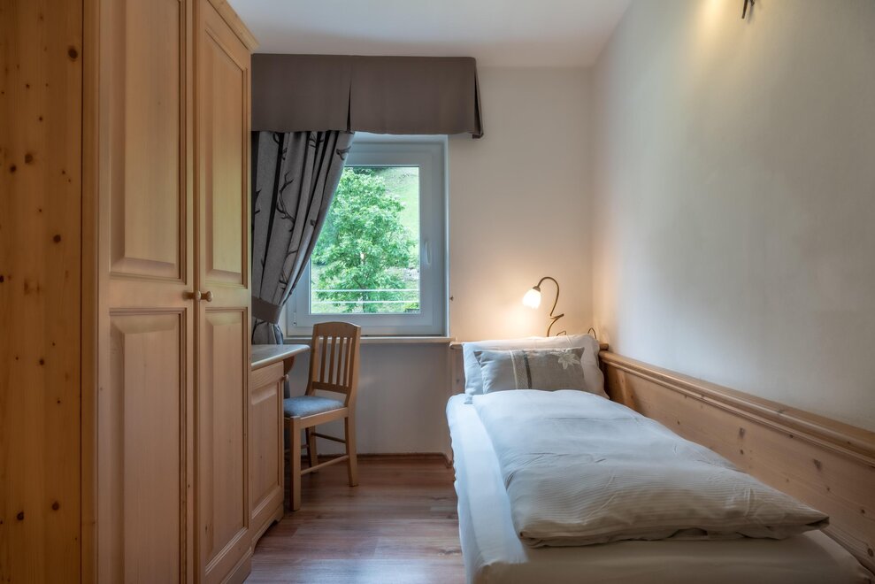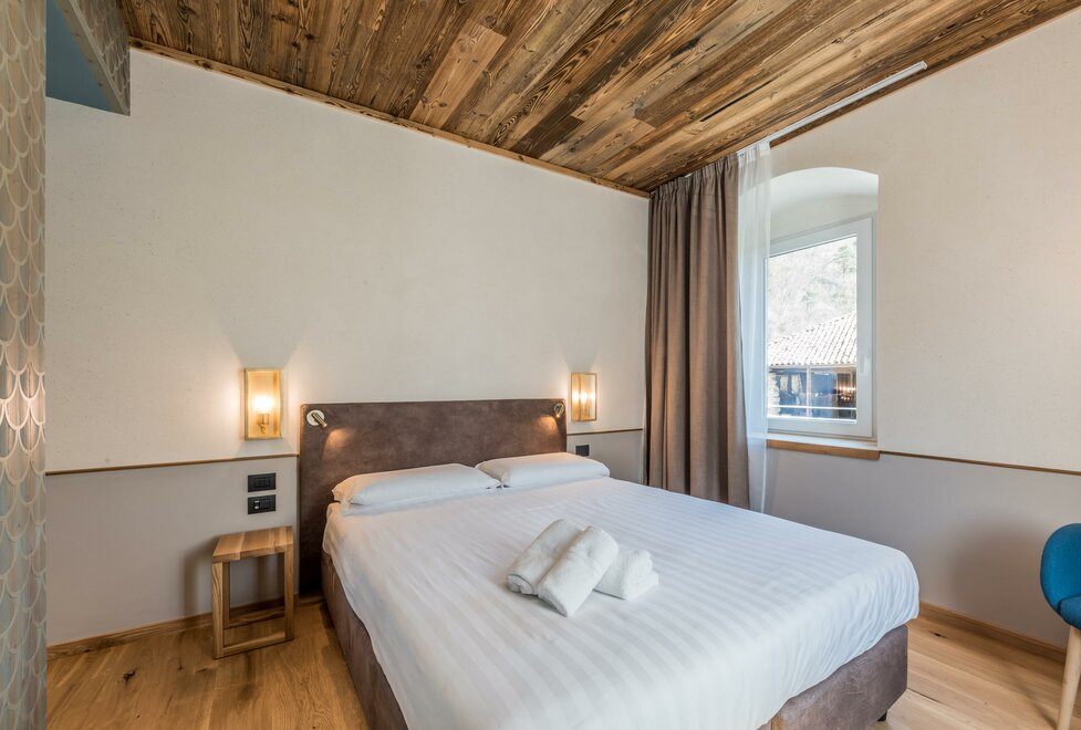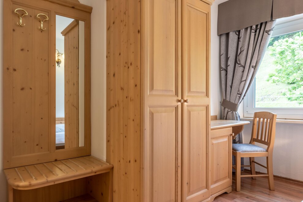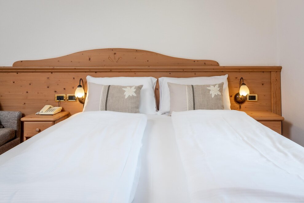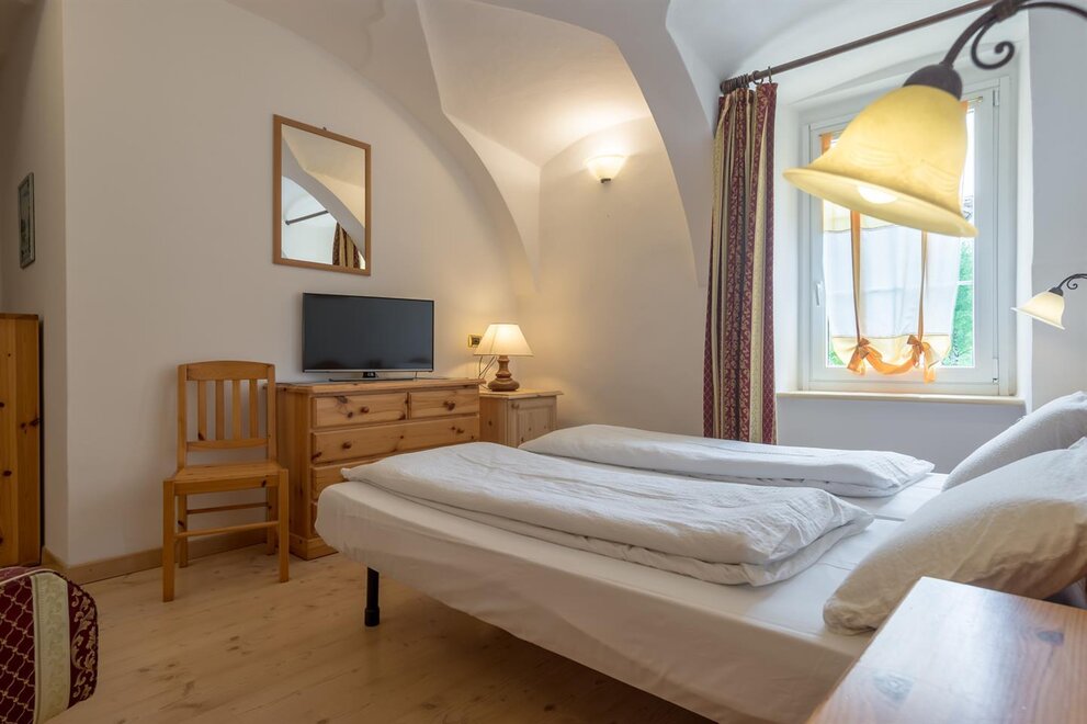 single room decorated with fir wood, wood parquet, programmable in-room heating, security box, minibar, sat. TV, Internet connection, bathroom with Wc, bidet, shower, hairdryer and soft duvet.