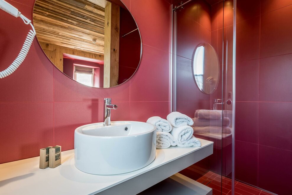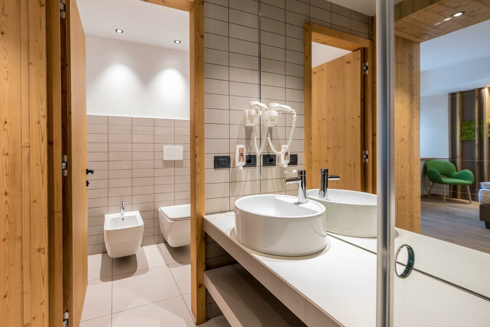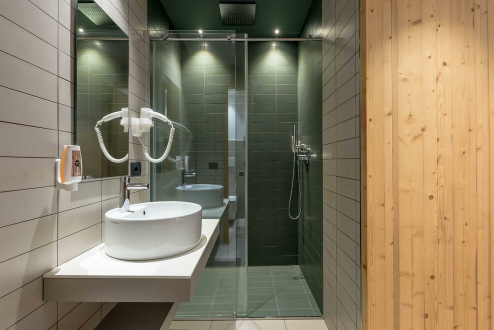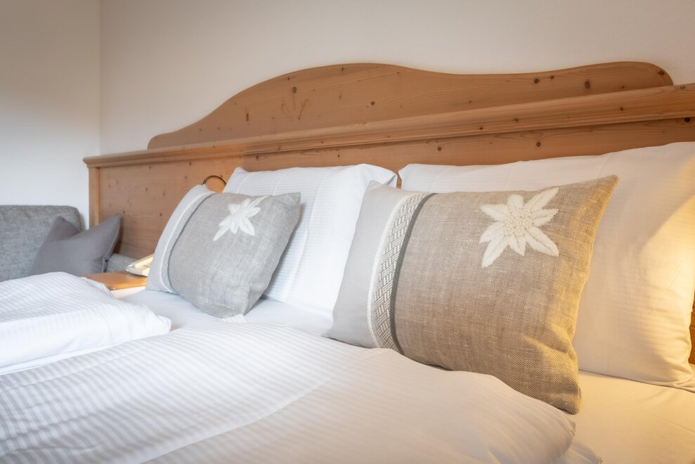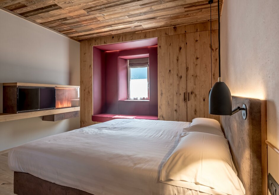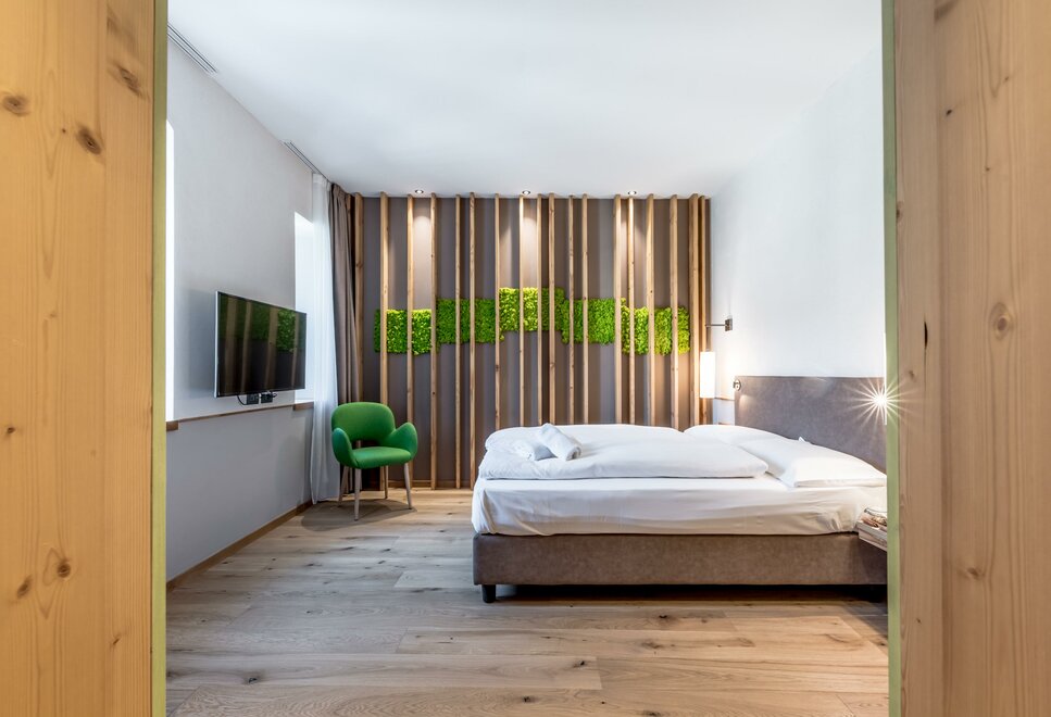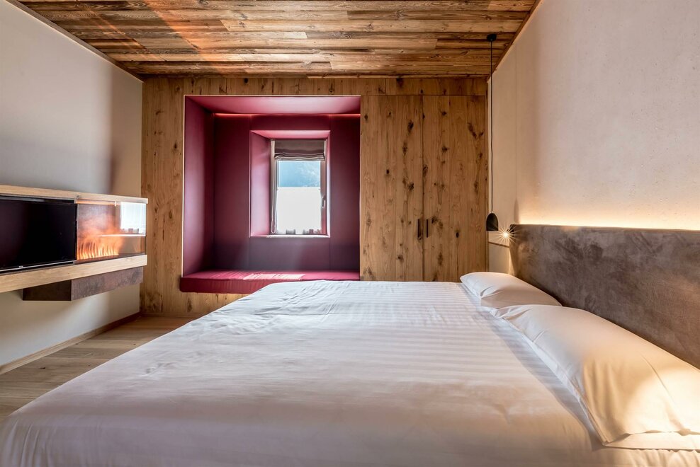single room decorated with fir wood, wood parquet, programmable in-room heating, security box, minibar, sat. TV, Internet connection, bathroom with Wc, bidet, shower, hairdryer and soft duvet.