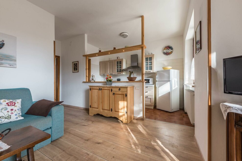 WiFi, island kitchen, dishes available, Wi-fi free of charge, dish sink, simple furnishing, Midweek cleaning only on request - for a fee, separate bedroom/living room, kitchen utensils, refrigerator, hairdryer, closet, living room, garden, gas stove, microwave, satellite TV