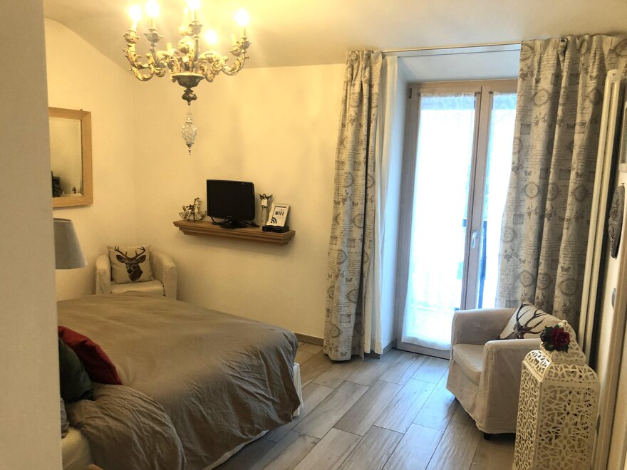 Triple or double room of 16m2, balcony with mountain and garden view. The bathroom is private and complete with all the necessary amenities. In the room there is a flat-screen TV with satellite channels and Wi-Fi.