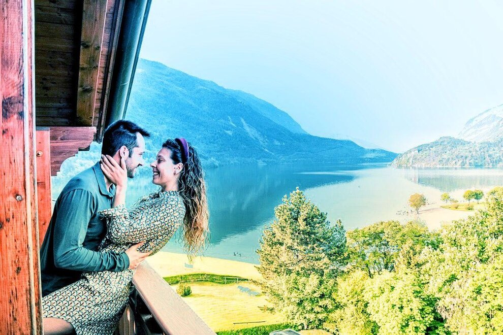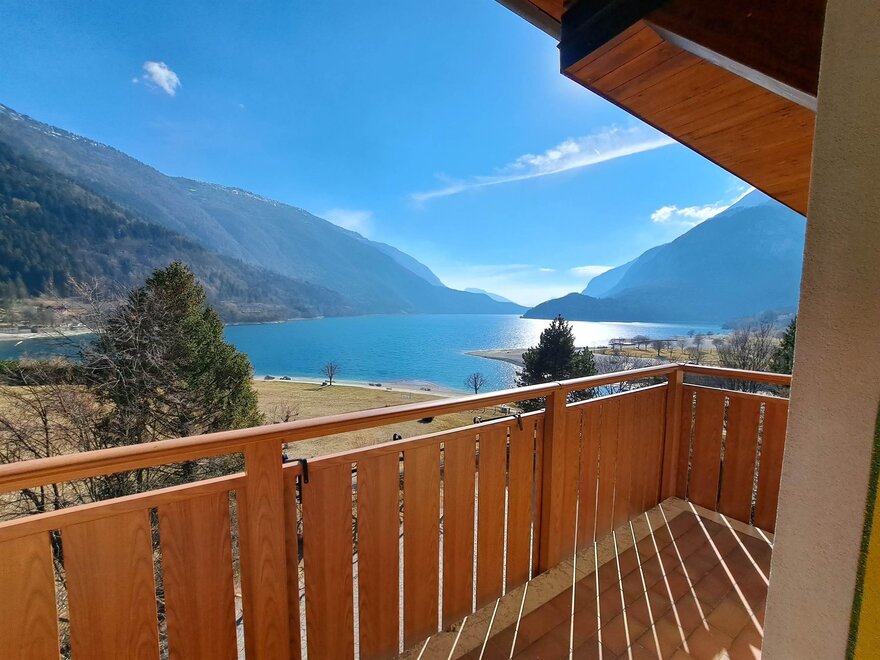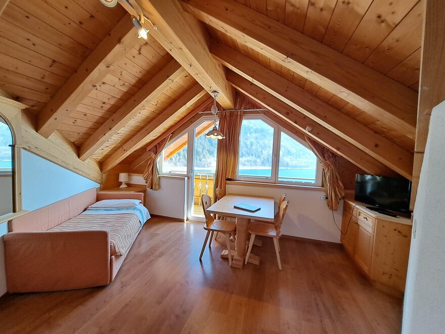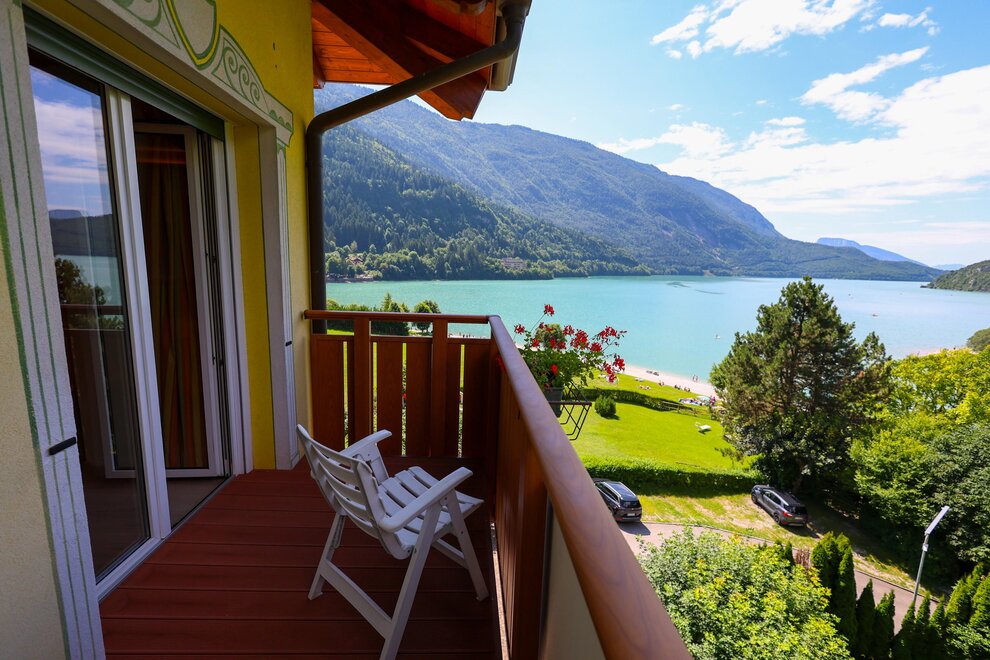 Spacious and bright room designed for couples or families with small children, featuring a balcony with a front or side view of Lake Molveno. Immerse yourself in the warm atmosphere created by the fir wood furnishings and admire the magnificent view from the sunny balcony.