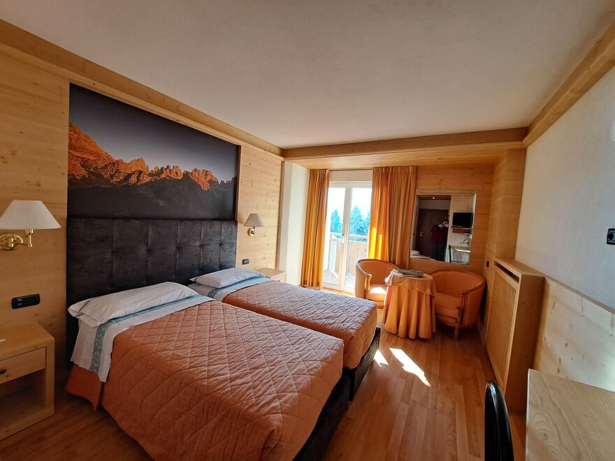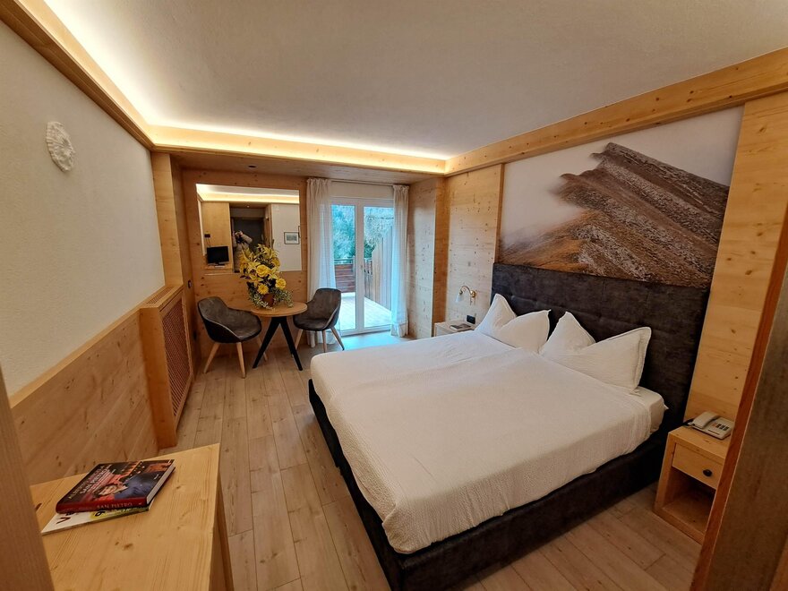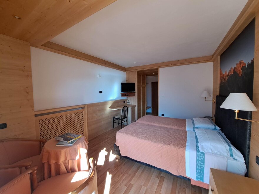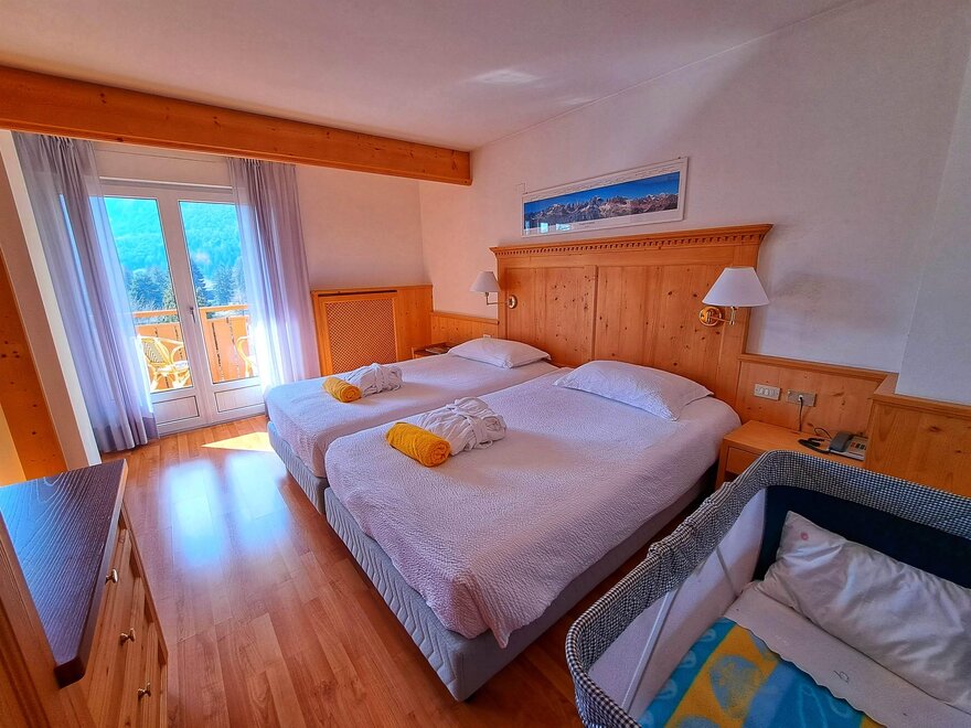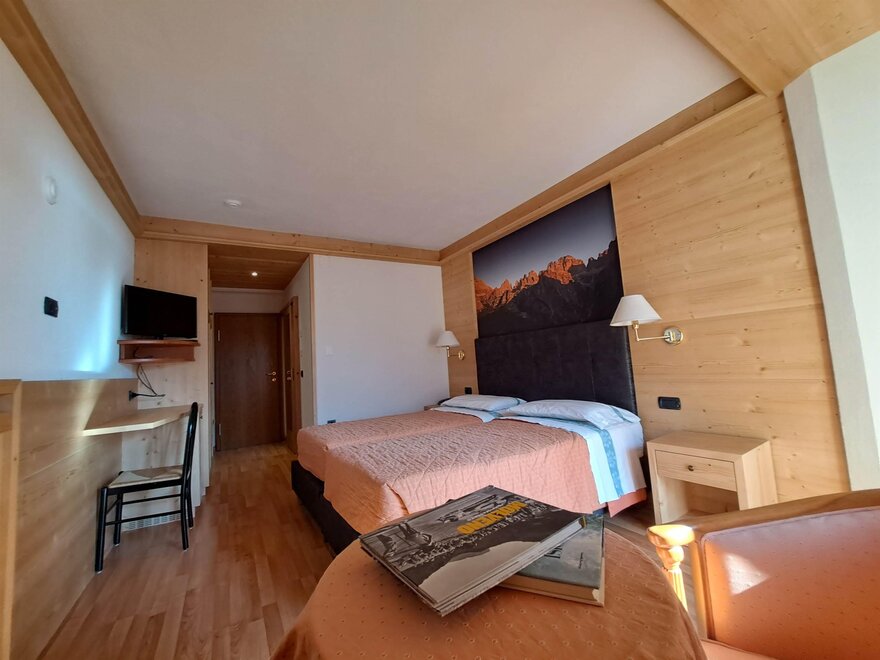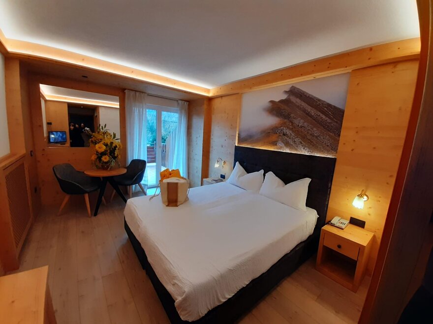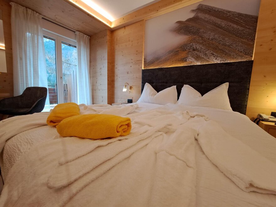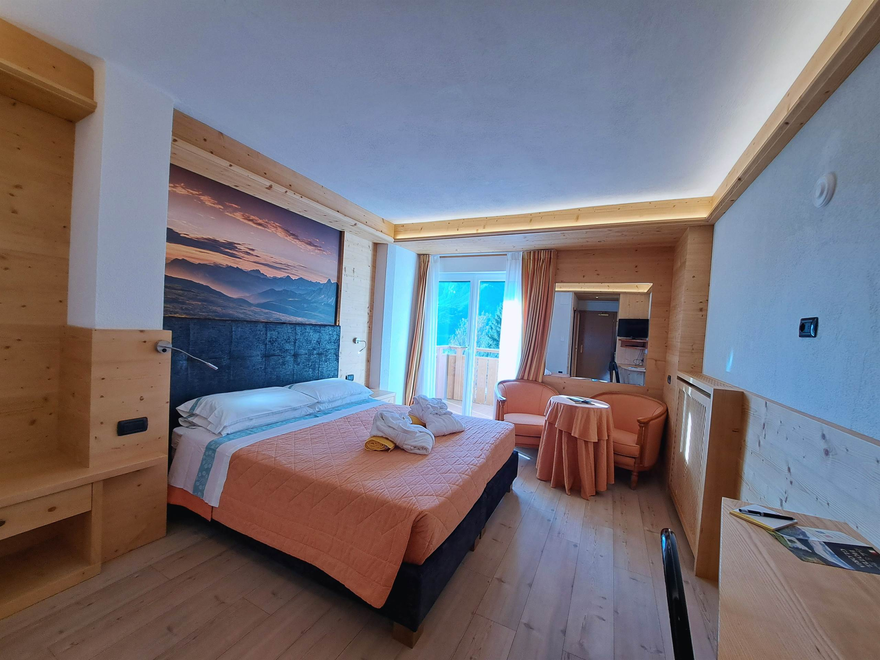 Bright double room measuring approx. 18 m² with a splendid view of the peaks of the Brenta Dolomites or a view of greenery. Choose between a single or double bed in this cosy alpine-style room.